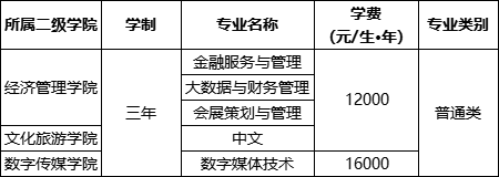 学校专业设置适应当下社会需求,切合学校发展,涵盖艺术学、经济学、法学、教育学、文学、历史学、工学和管理学八大本科学科门类与文化艺术、新闻传播、资源环境与安全、土木建筑、财经商贸、旅游和教育与体育七大专科学科门类,涉及音乐与舞蹈学类、戏剧与影视学类、美术学类、设计学类、金融学类、民族学类、教育学类、中国语言文学类、外国语言文学类、历史学类、材料类、电子信息类、建筑类、工商管理类、公共管理类、物流管理与工程类、旅游管理类、艺术设计类、表演艺术类、广播影视类、资源勘查类、建筑设计类、金融类、财务会计类、市场营销类、旅游类、会展类、语言类、文秘类和体育类等三十个本、专科专业类别。