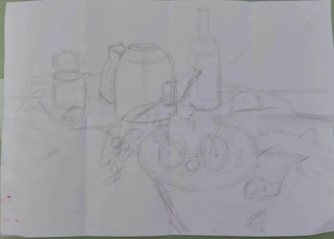 考题内容: 紫灰色调,铝制罐头,不锈钢水壶,红酒瓶,盘子,盘子里面两个苹果一个橘子,外面还有一个苹果,两颗红枣和像葡萄一样摆的桂圆