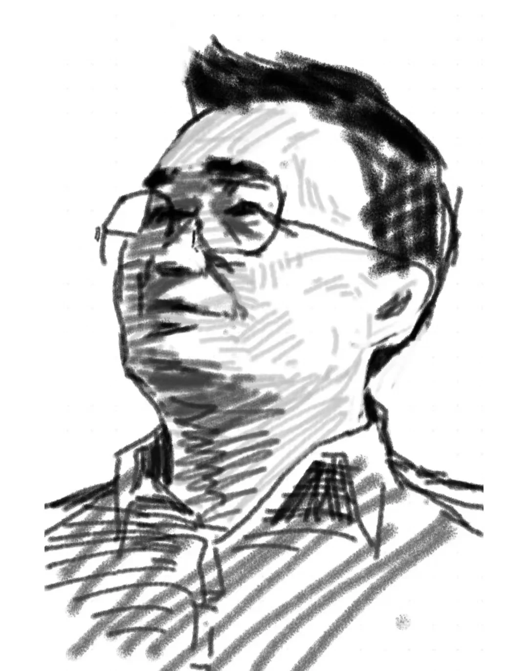 画照片,男中年,四分之三侧面,仰头,微笑,戴眼镜。