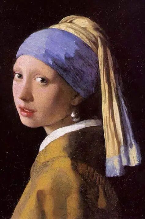 参考名画《戴珍珠耳环的少女》一个人操作电脑(戴珍珠耳环的少女)、一个指着操作电脑的人的人、两个正在沉思的人,题目:《集思广益》