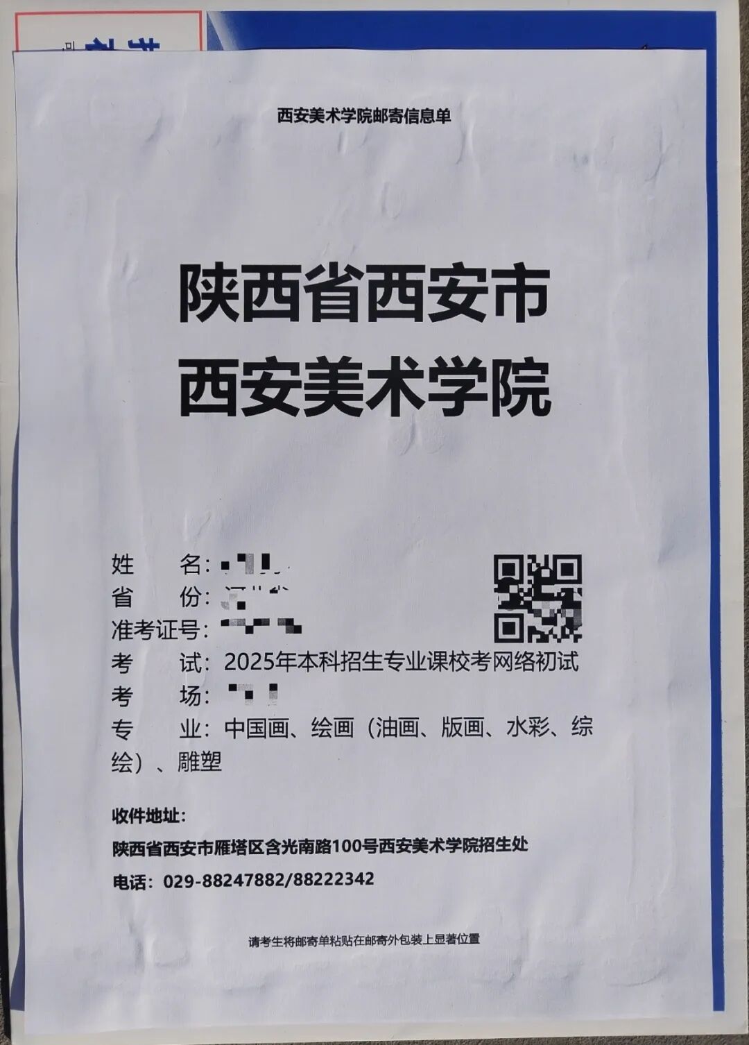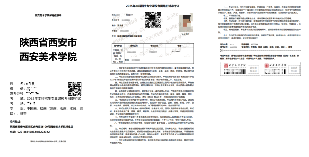 考生须于2025年1月12日9:00~2025年1月15日19:00登录西安美术学院本科招生专业课校考网上报名系统(https://user.artstudent.cn/login/10729.htm),点击“打印中心”→“打印准考证”打印准考证和邮寄信息单(邮寄信息单和准考证图例如下图所示)。