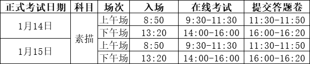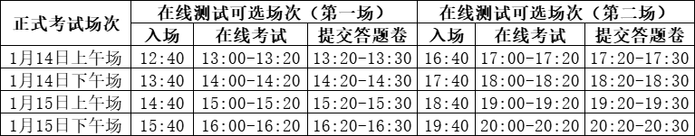 在线测试于2025年1月12日12:30-20:30进行,每位考生须在准考证上规定的两个在线测试场次中,至少选择一场进行测试,熟悉考试流程,在线测试场次及时间安排如下: