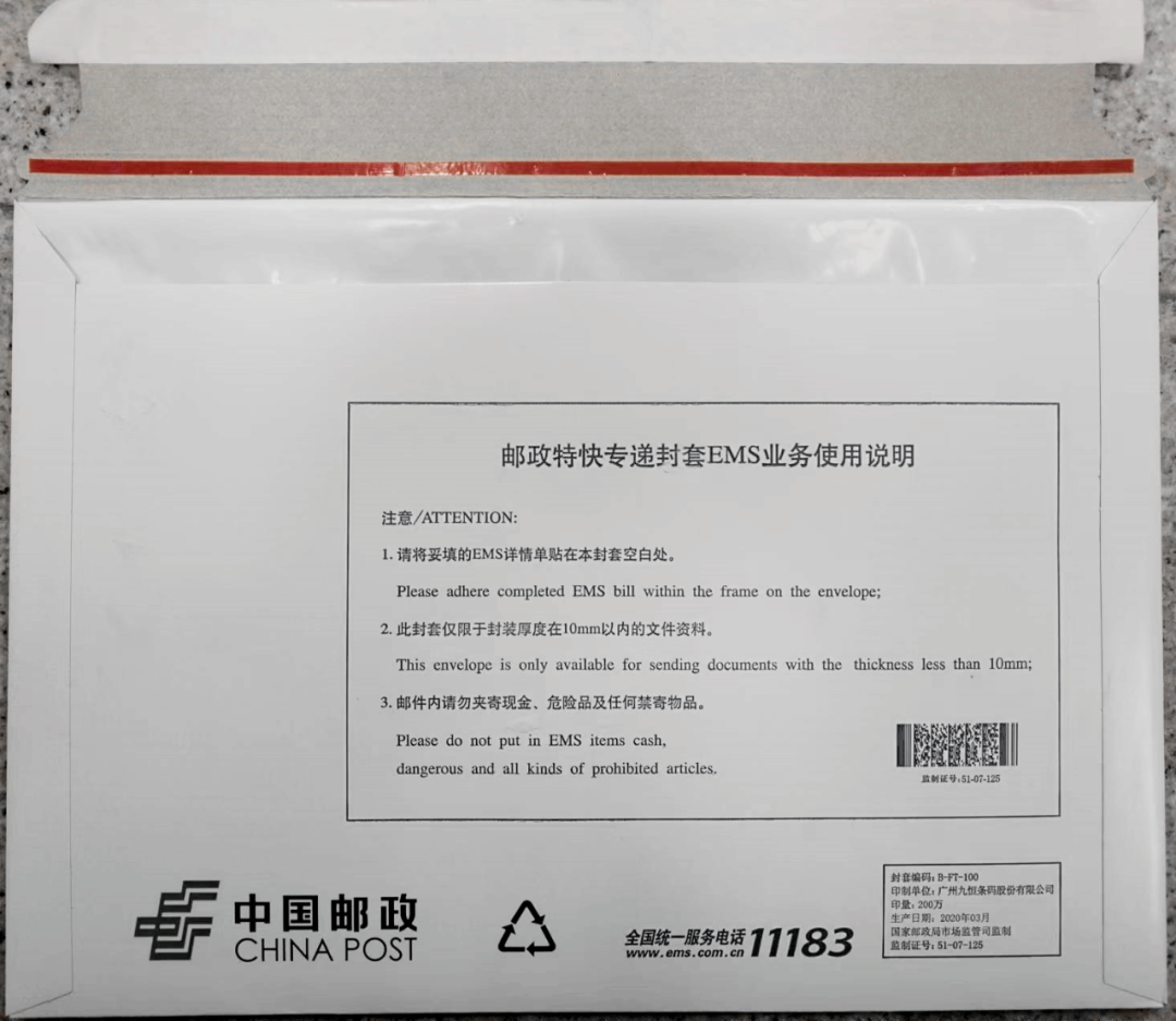 不透明防水密封袋1个、封口胶带、油性马克笔、胶水、EMS邮寄信封(32cm×22.7cm)。