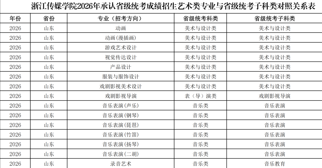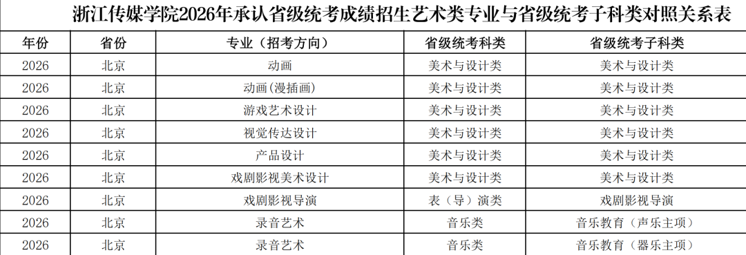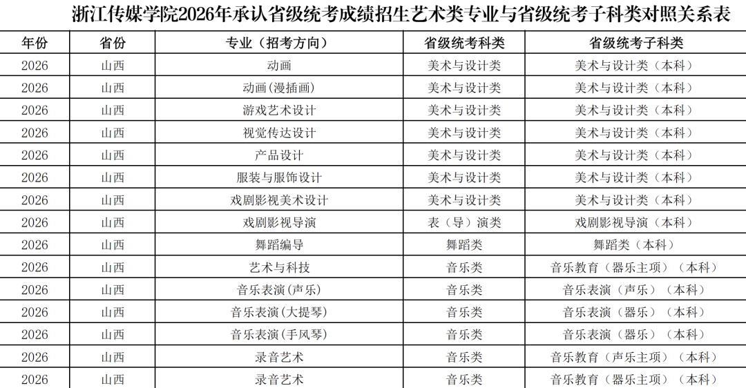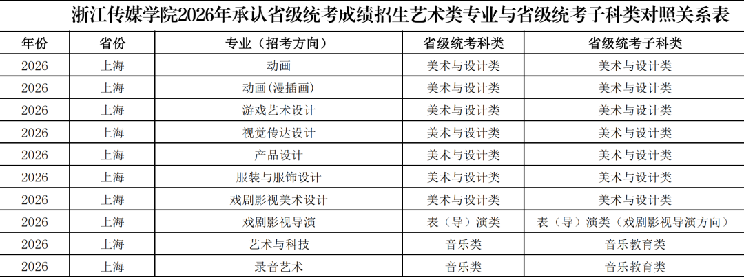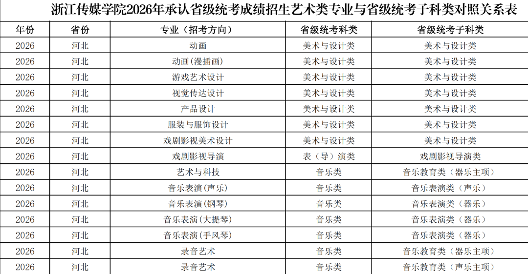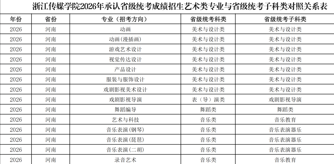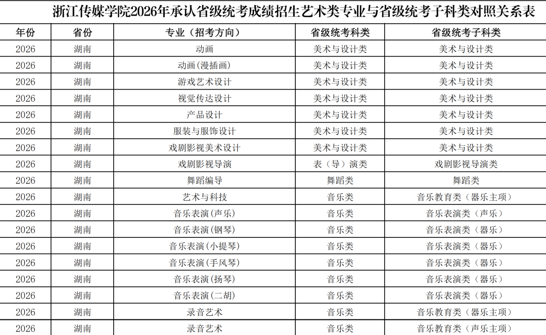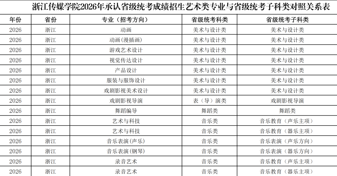 浙江传媒学院2026年承认省级统考成绩招生艺术类专业与省级统考子科类对照关系表 按照教育部相关文件规定,经各省级招生考试机构审核通过,现将我校2026年承认省级统考成绩招生艺术类专业与省级统考子科类对照关系公布如下。说明:游戏艺术设计专业正在报批中。以下各专业(招考方向)招生计划,以教育部和各省级招生考试机构最终审定的计划为准。点击查看各省子科类对照关系表