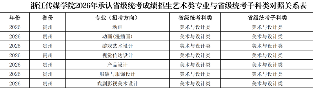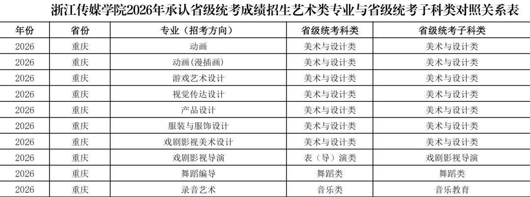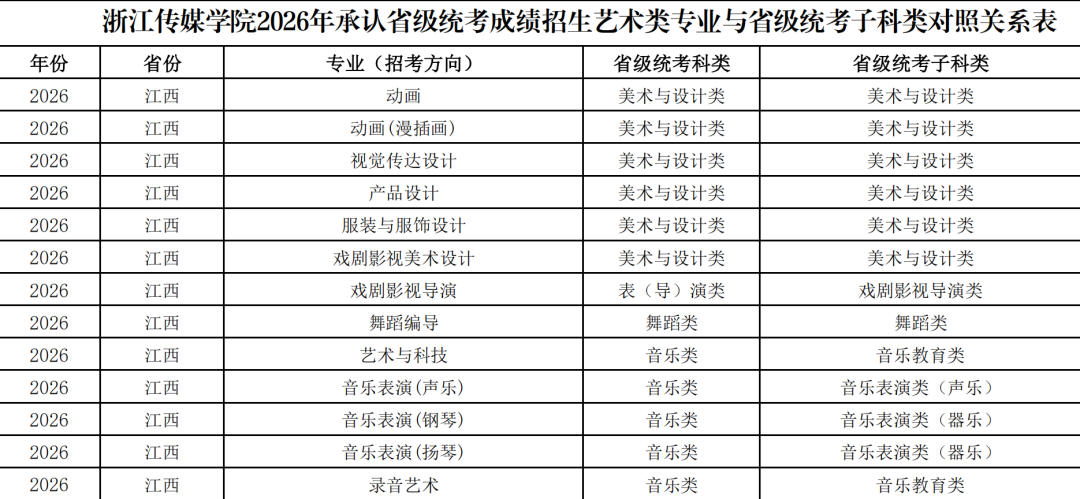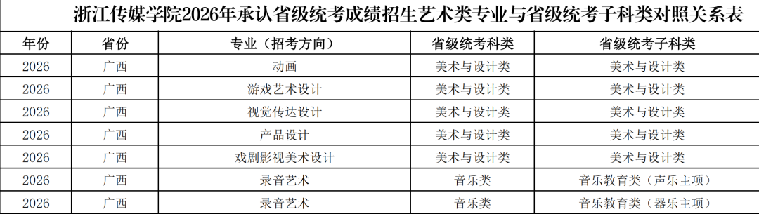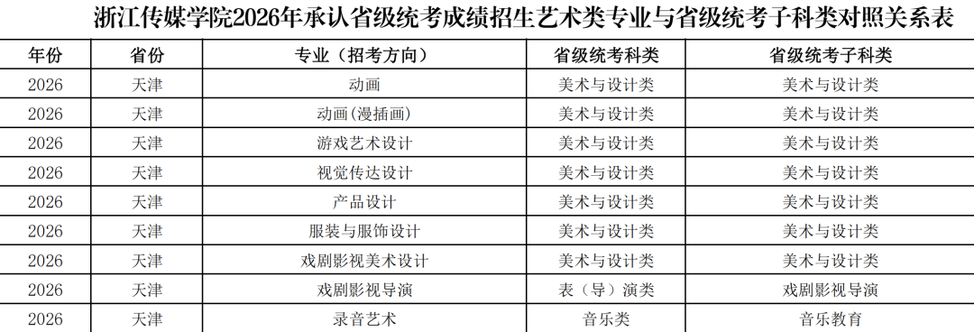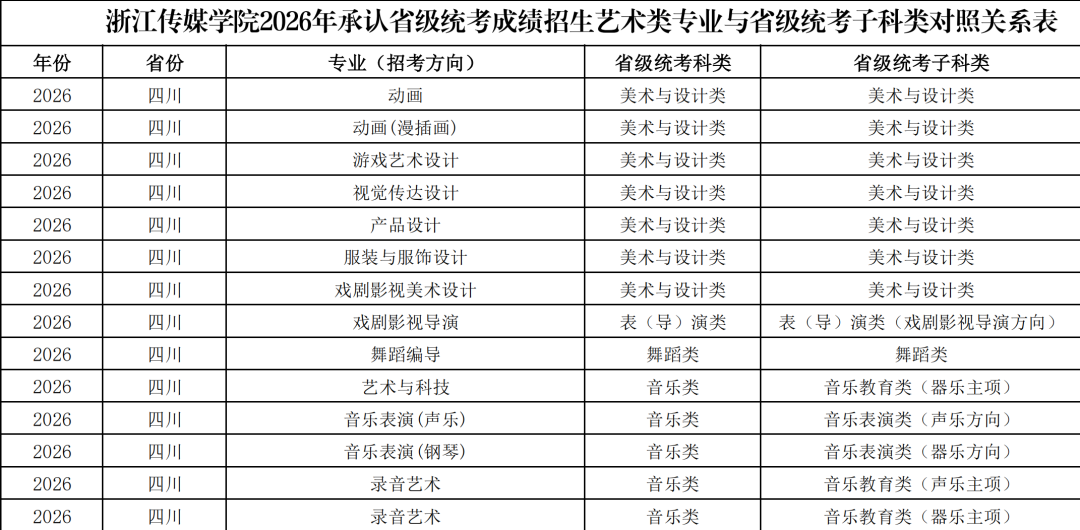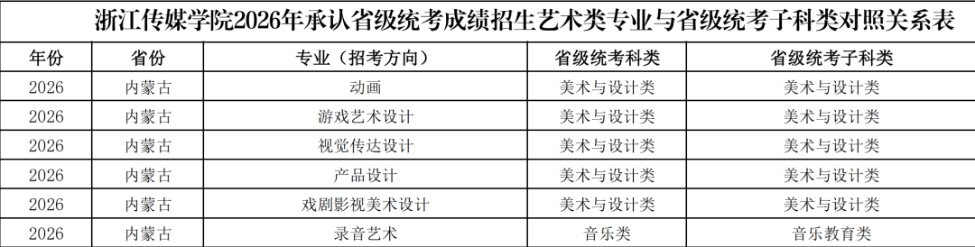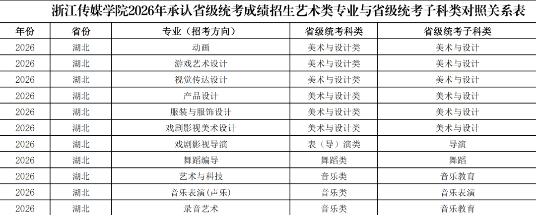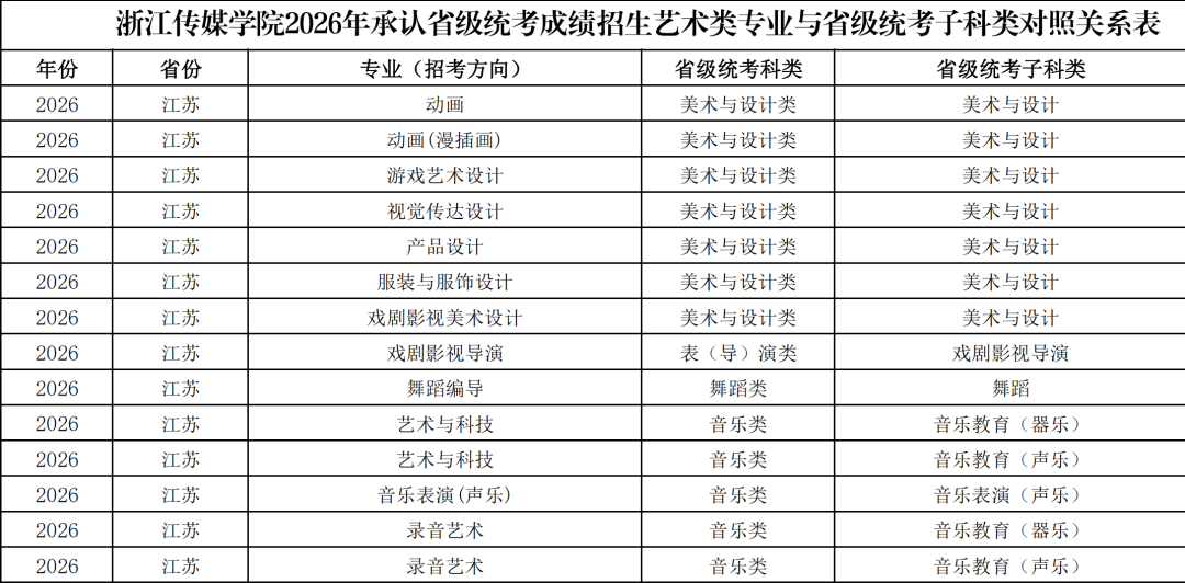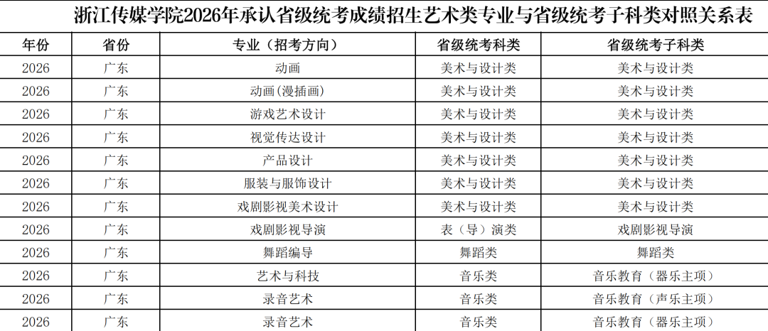 浙江传媒学院2026年承认省级统考成绩招生艺术类专业与省级统考子科类对照关系表 按照教育部相关文件规定,经各省级招生考试机构审核通过,现将我校2026年承认省级统考成绩招生艺术类专业与省级统考子科类对照关系公布如下。说明:游戏艺术设计专业正在报批中。以下各专业(招考方向)招生计划,以教育部和各省级招生考试机构最终审定的计划为准。点击查看各省子科类对照关系表
