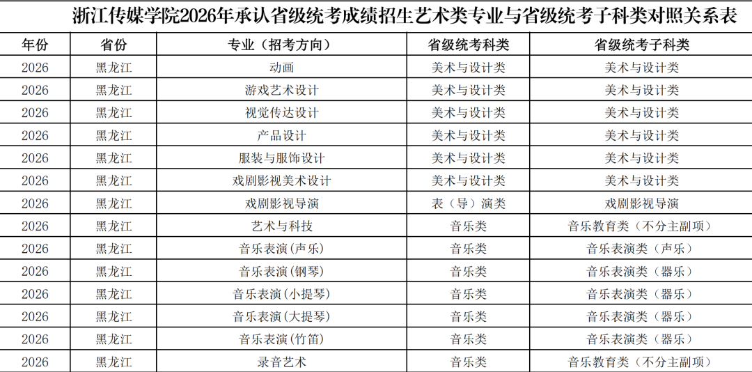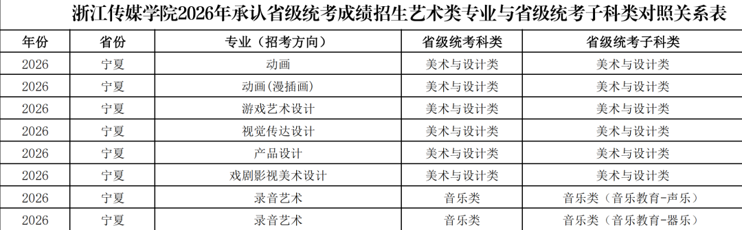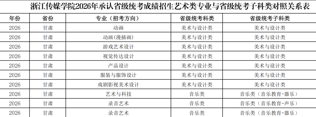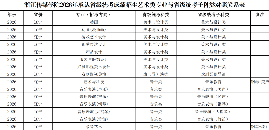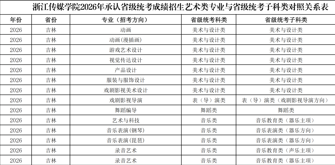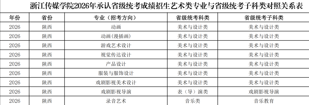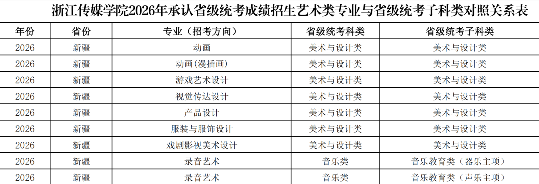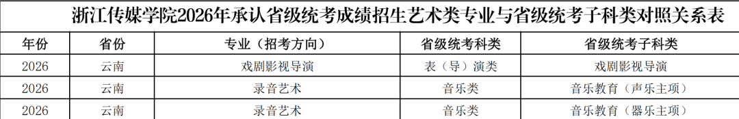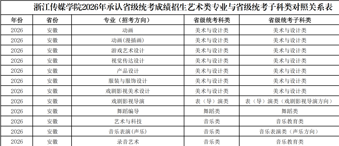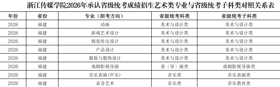 浙江传媒学院2026年承认省级统考成绩招生艺术类专业与省级统考子科类对照关系表 按照教育部相关文件规定,经各省级招生考试机构审核通过,现将我校2026年承认省级统考成绩招生艺术类专业与省级统考子科类对照关系公布如下。说明:游戏艺术设计专业正在报批中。以下各专业(招考方向)招生计划,以教育部和各省级招生考试机构最终审定的计划为准。点击查看各省子科类对照关系表