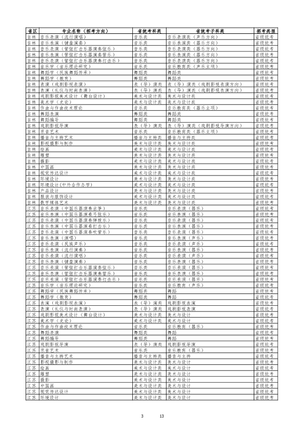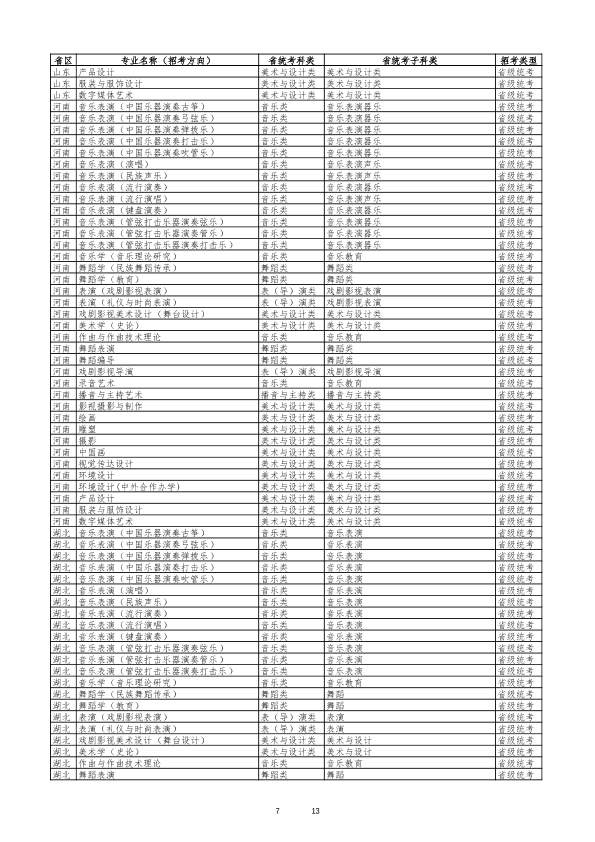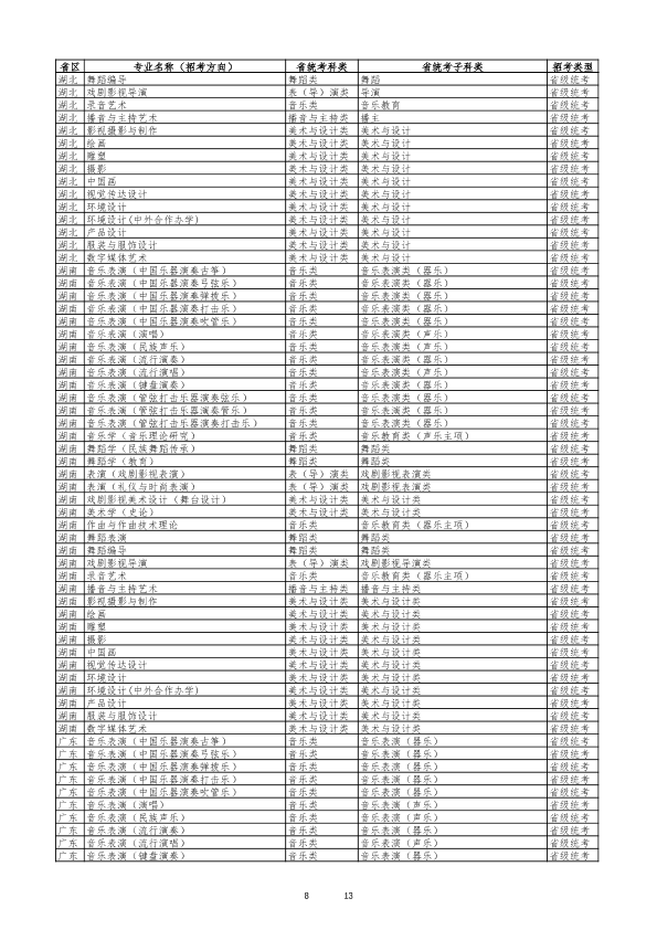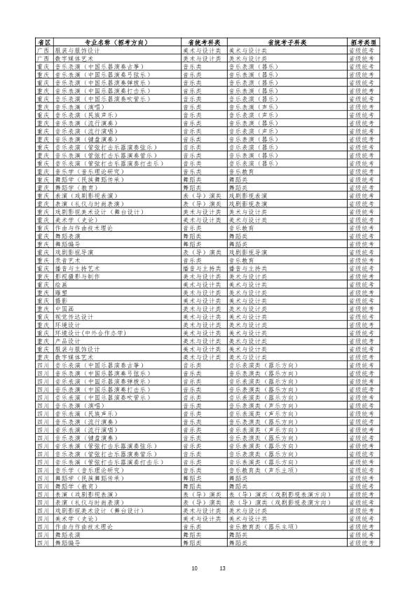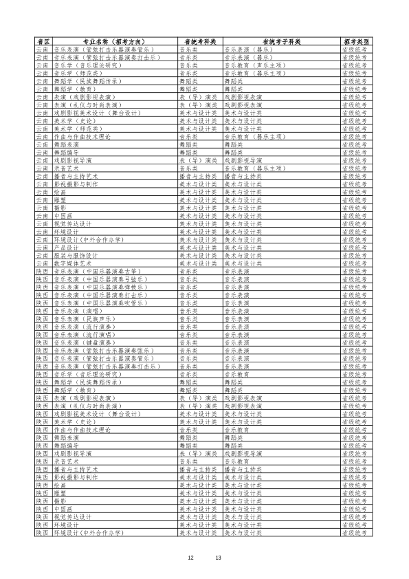 云南艺术学院2026年艺术类专业与各省统考科类对照表