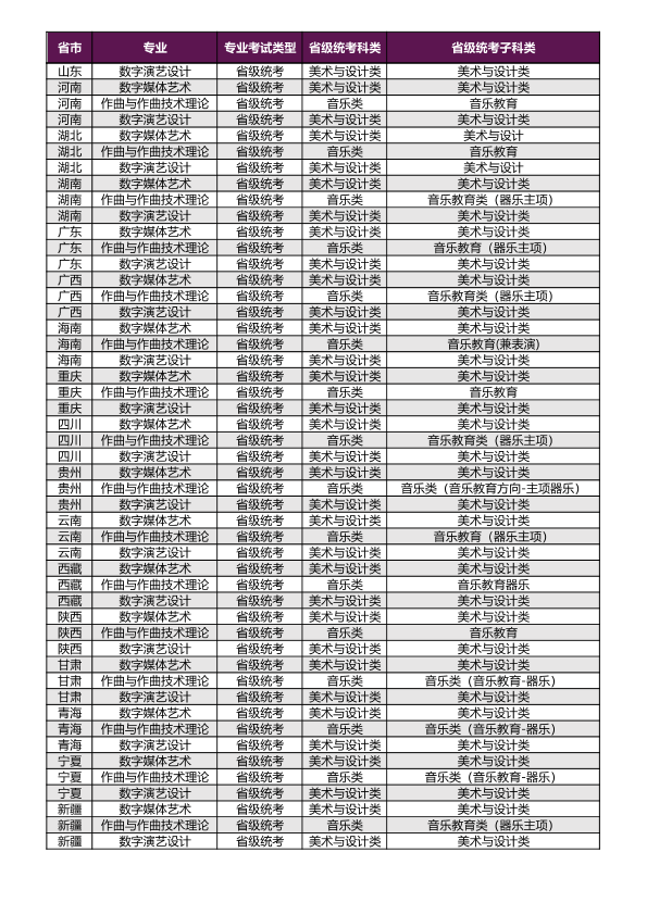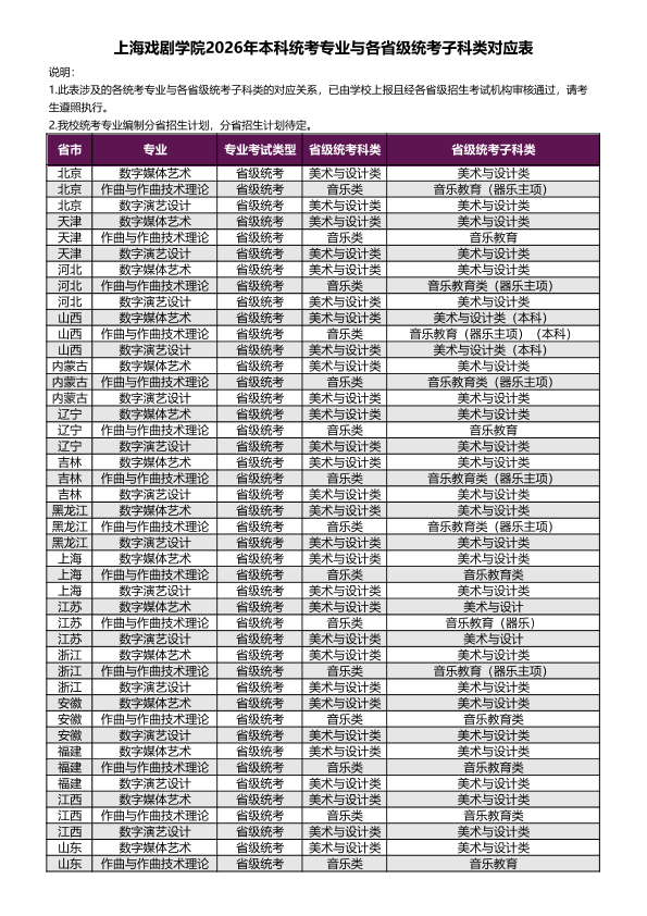 上海戏剧学院2026年本科统考专业与各省级统考子科类对应表
