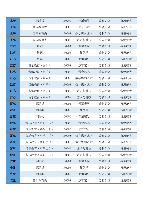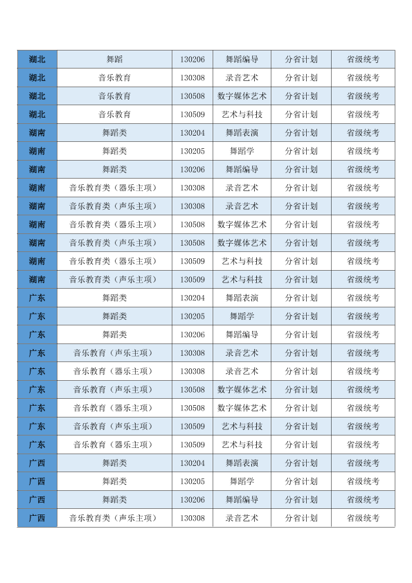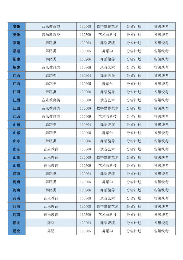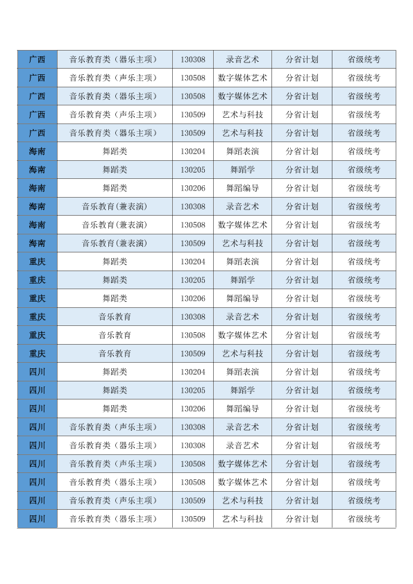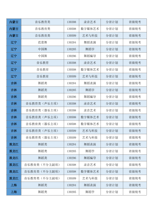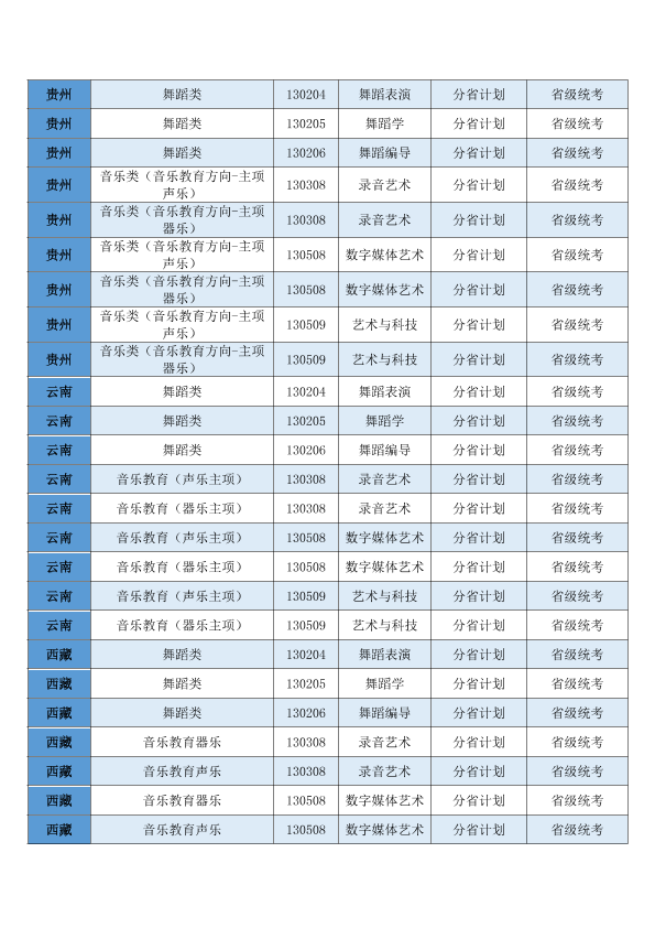 西安音乐学院2026年本科招生非校考专业和各省(区、市)统考子科类对照表