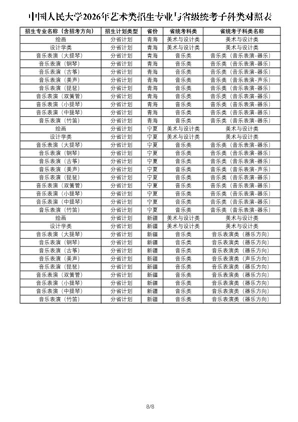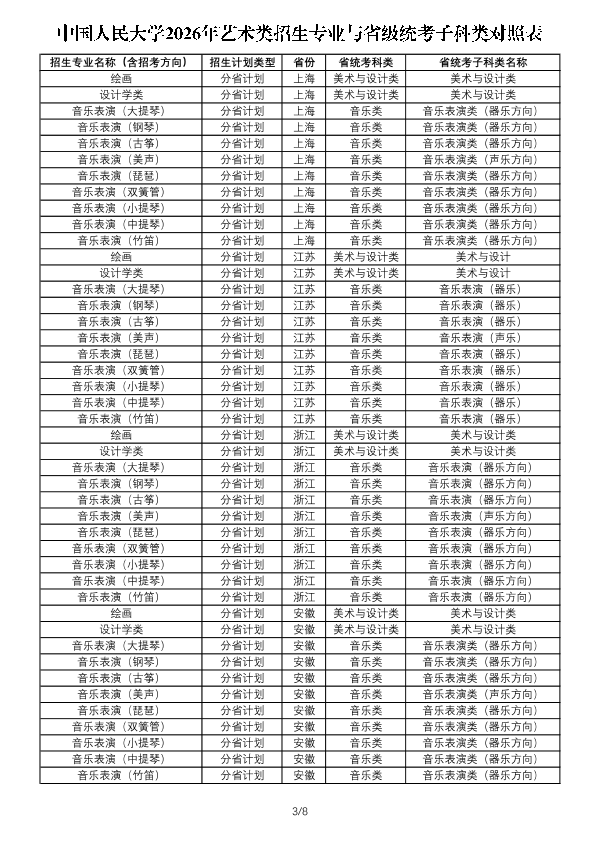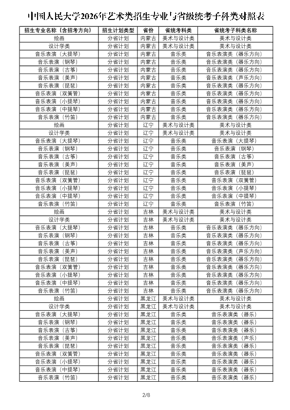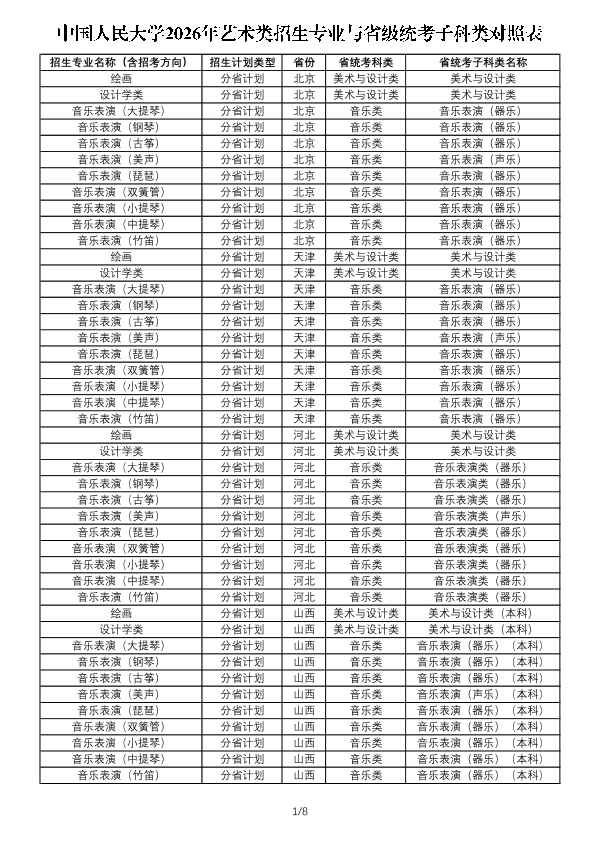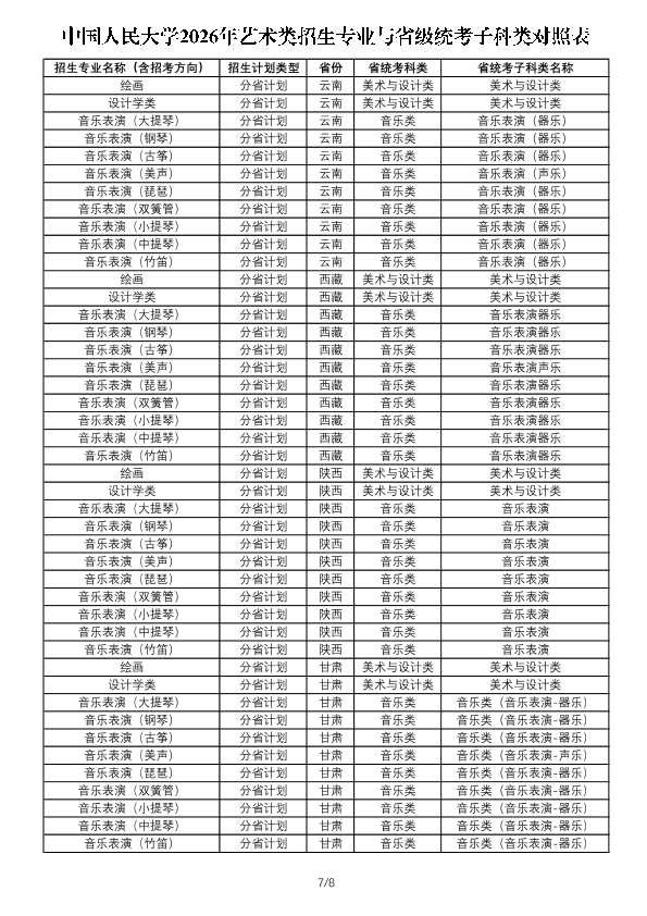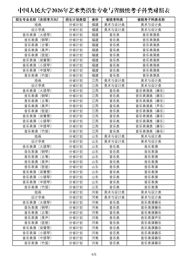 注:1.此表用于考生了解艺术类各专业与省级统考子科类对照关系,各省份实际招生专业、招生计划及相关要求以省级招生考试机构和我校后续公布的招生计划及详细要求为准。