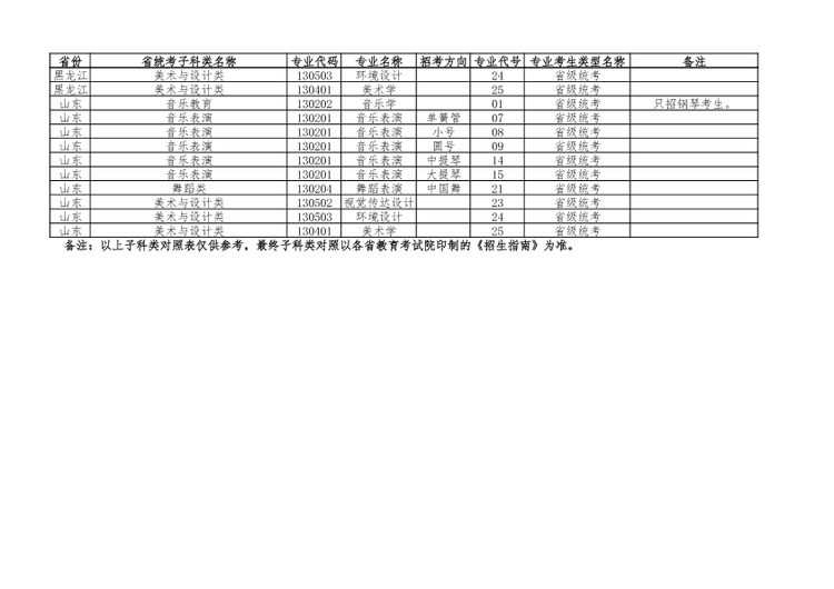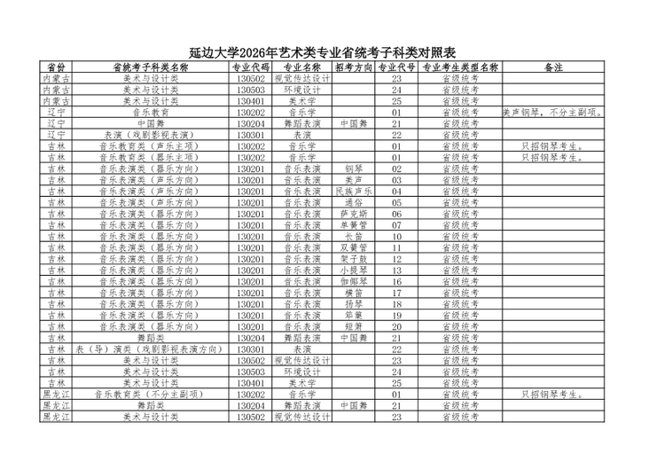 附件:延边大学2026年艺术类专业省统考子科类对照表