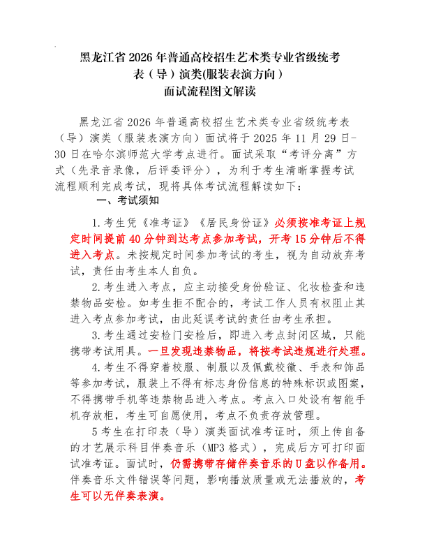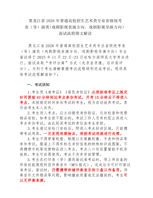 黑龙江省2026年普通高等学校招生艺术类专业省级统考表(导)演类面试将在哈尔滨师范大学考点进行,戏剧影视表演、戏剧影视导演方向将于2025年11月22日-23日进行考试,服装表演方向将于2025年11月29日-30日进行考试,本次面试采取“考评分离”方式(先录音录像,后评委评分)。为保障各位考生顺利应考,现将考试安排及相关要求公告如下:
