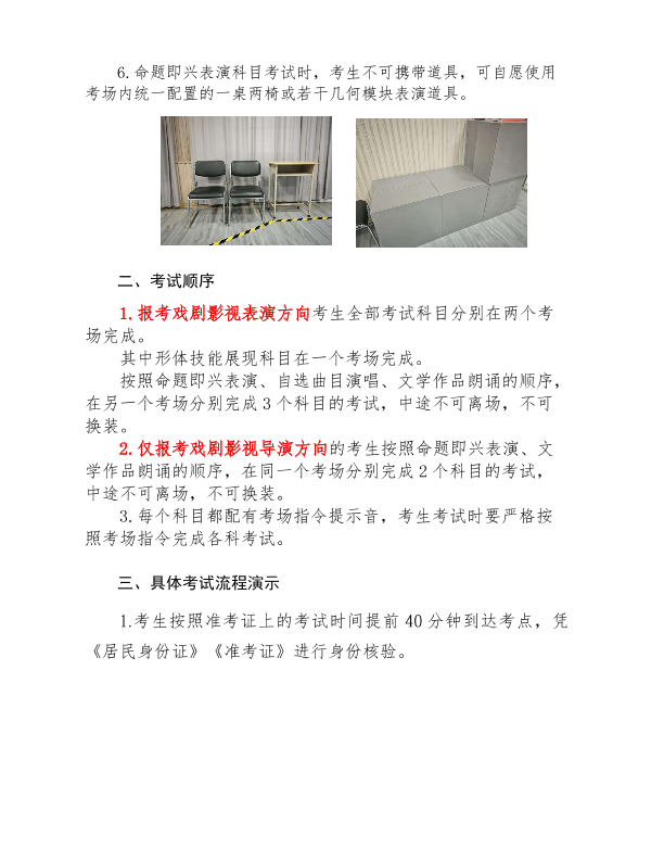 6.命题即兴表演科目考试时,考生不可携带道具,可自愿使用考场内统一配置的一桌两椅或若干几何模块表演道具。