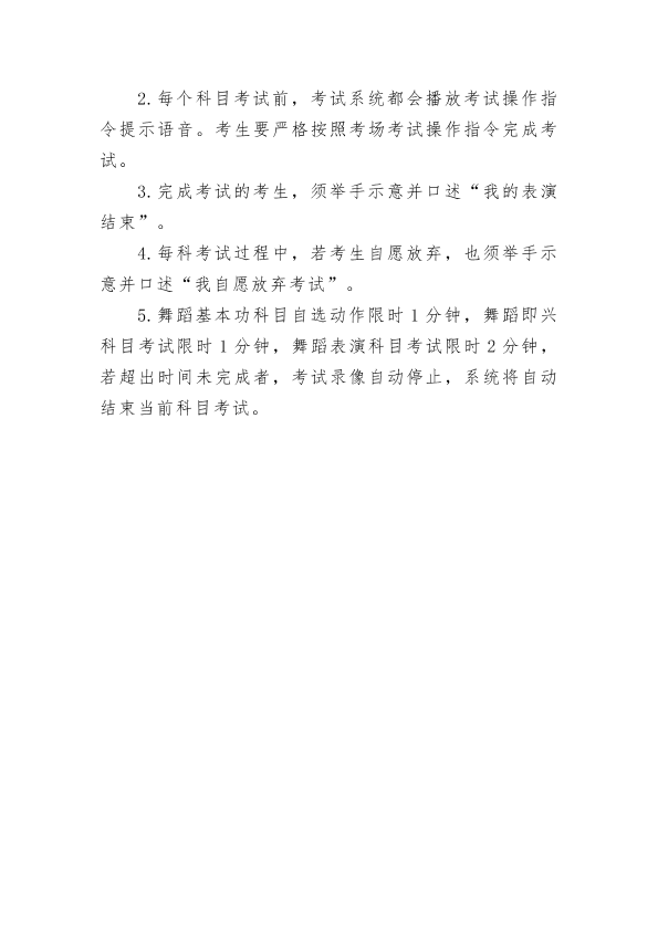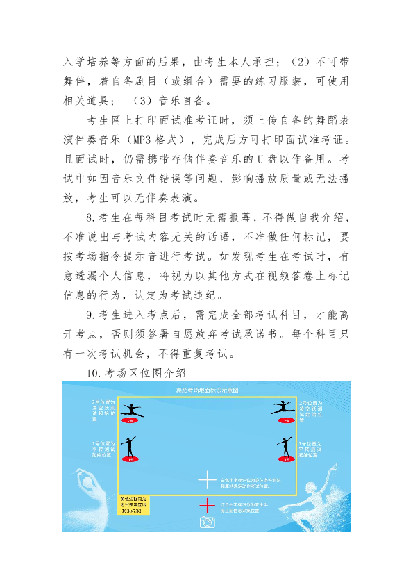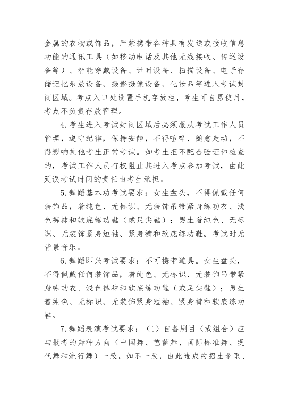 6.舞蹈表演考试要求:(1)自备剧目(或组合)应与报考的舞种方向(中国舞、芭蕾舞、国际标准舞、现代舞和流行舞)一致。如不一致,由此造成的招生录取、入学培养等方面的后果,由考生本人承担;(2)不可带舞伴,着自备剧目(或组合)需要的练习服装,可使用相关道具;(3)音乐自备。
