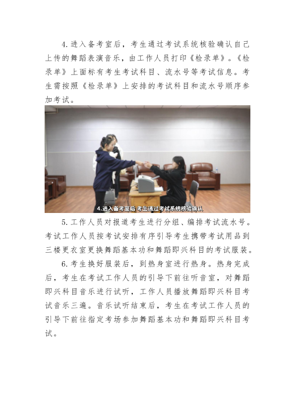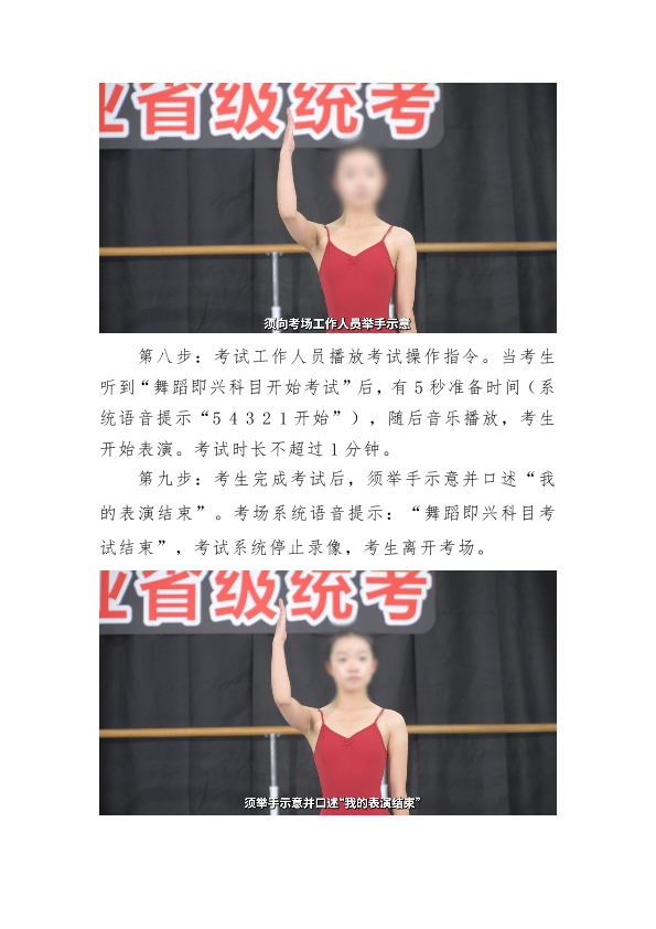 5.舞蹈即兴考试要求:不可携带道具。女生盘头,不得佩戴任何装饰品,着纯色、无标识、无装饰吊带紧身练功衣、浅色裤袜和软底练功鞋(或足尖鞋);男生着纯色、无标识、无装饰紧身短袖、紧身裤和软底练功鞋。