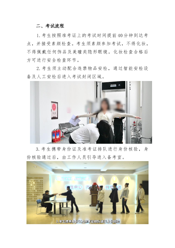 3.考生进入考试封闭区域后必须服从考试工作人员安排,遵守纪律,保持安静,不得喧哗、随意走动,不得影响其他考生正常考试。如考生拒不配合验证和检查,考试工作人员有权阻止其进入考点参加考试,由此延误考试时间的责任由考生承担。