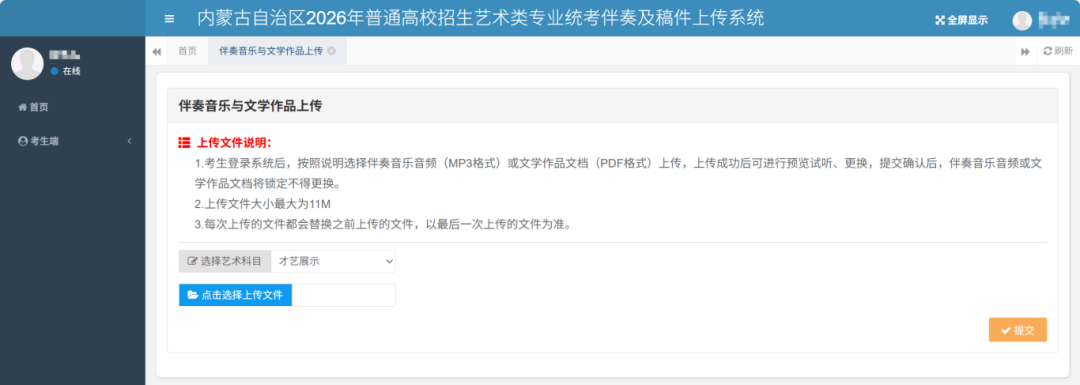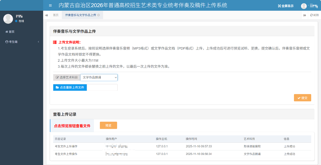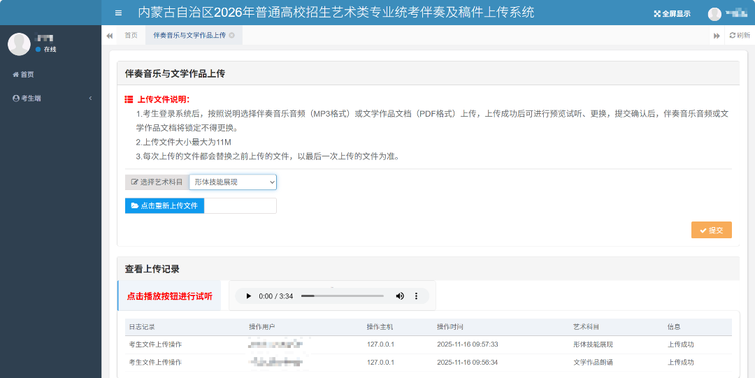 操作步骤:选择才艺展示科目,然后选择该科目对应的音频文件,“点击选择上传文件”按钮选择文件后系统自动上传。系统自动记录考生每次操作的日志。