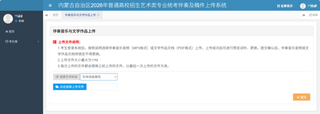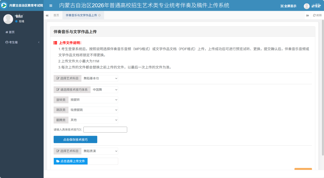 舞蹈类考生还需上报舞蹈表演科目伴奏音乐音频。操作步骤:选择舞蹈表演科目,然后选择该科目对应的音频文件,“点击选择上传文件”按钮选择文件后系统自动上传。系统自动记录考生每次操作的日志。