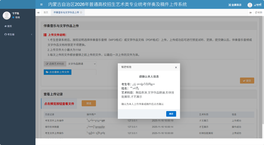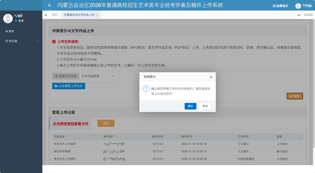 所有科目均上传无误后,点击右侧“提交”按钮,确认本人信息,对已上传的音频或文档进行锁定,锁定后,将无法修改上传音频或文档。锁定前,可修改音频或文档。