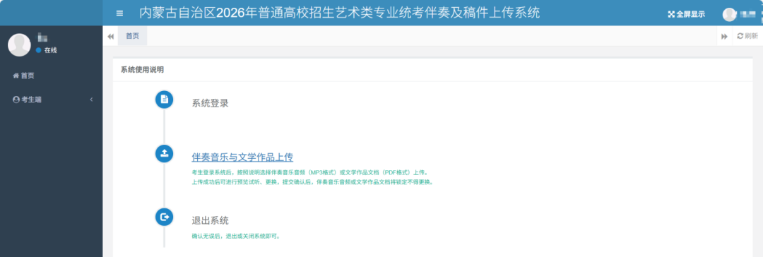考生通过 ❶ 系统登录 ❷ 伴奏与文学作品上传 ❸ 伴奏音乐试听和文档预览 ❹ 提交确认,四步完成此项工作(特别注意:只有完成了确认提交才能成功)。具体步骤如下: