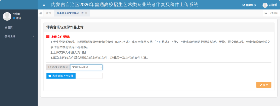 表导演方向考生需要上报文学作品朗诵科目的稿件。操作步骤:选择文学作品朗诵科目,然后选择该科目对应的PDF文件稿件,“点击选择上传文件”按钮选择文件后系统自动上传。系统自动记录考生每次操作的日志。