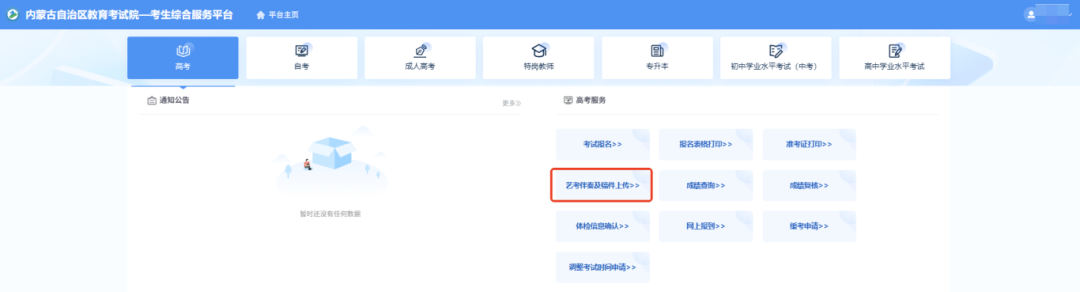 考生登录内蒙古自治区教育考试院考生综合服务平台(网址:https://www4.nm.zsks.cn/BaseStudent/)后,点击“高考”-“艺考伴奏及稿件上传”后,点击伴奏音乐与文学作品上传,进入伴奏音乐与文学作品上传界面。