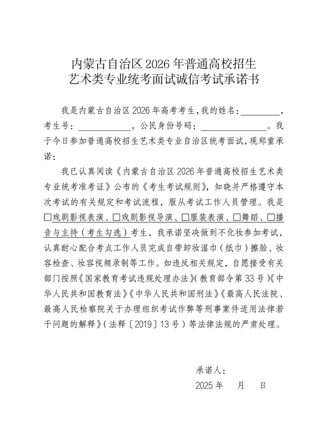 内蒙古自治区2026年普通高校招生艺术类专业统考面试诚信考试承诺书