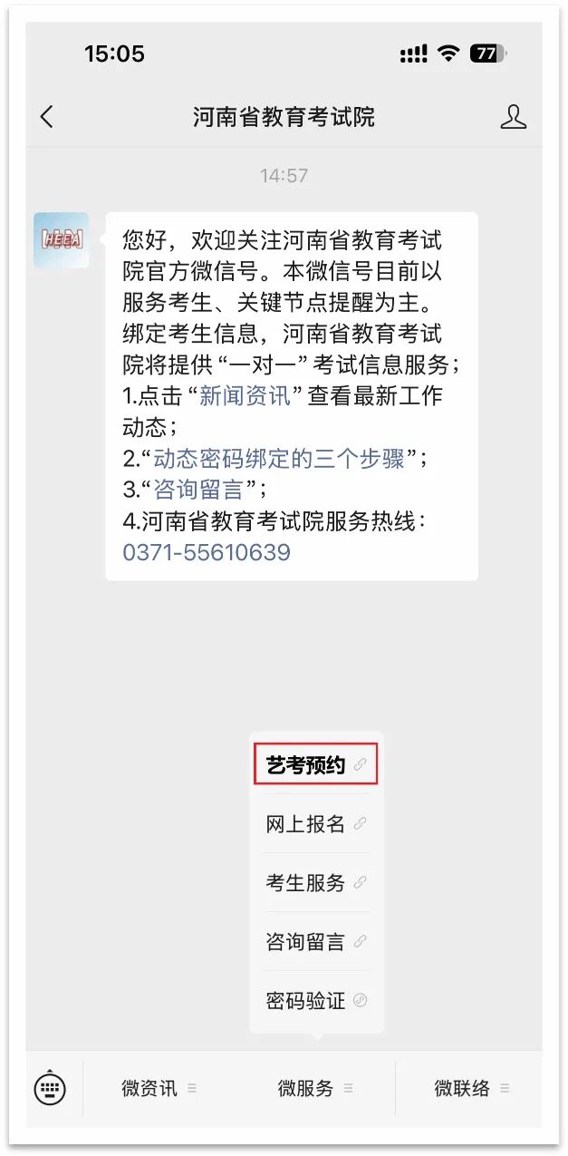 点击“河南省教育考试院”微信公众号菜单,选择【微服务】→【艺考预约】,进入艺考预约的小程序,进行预约操作。预约开始前,考生可以提前完成注册、登录,查看考试流程模拟动画,以便在预约开启时直接进入考试预约环节。