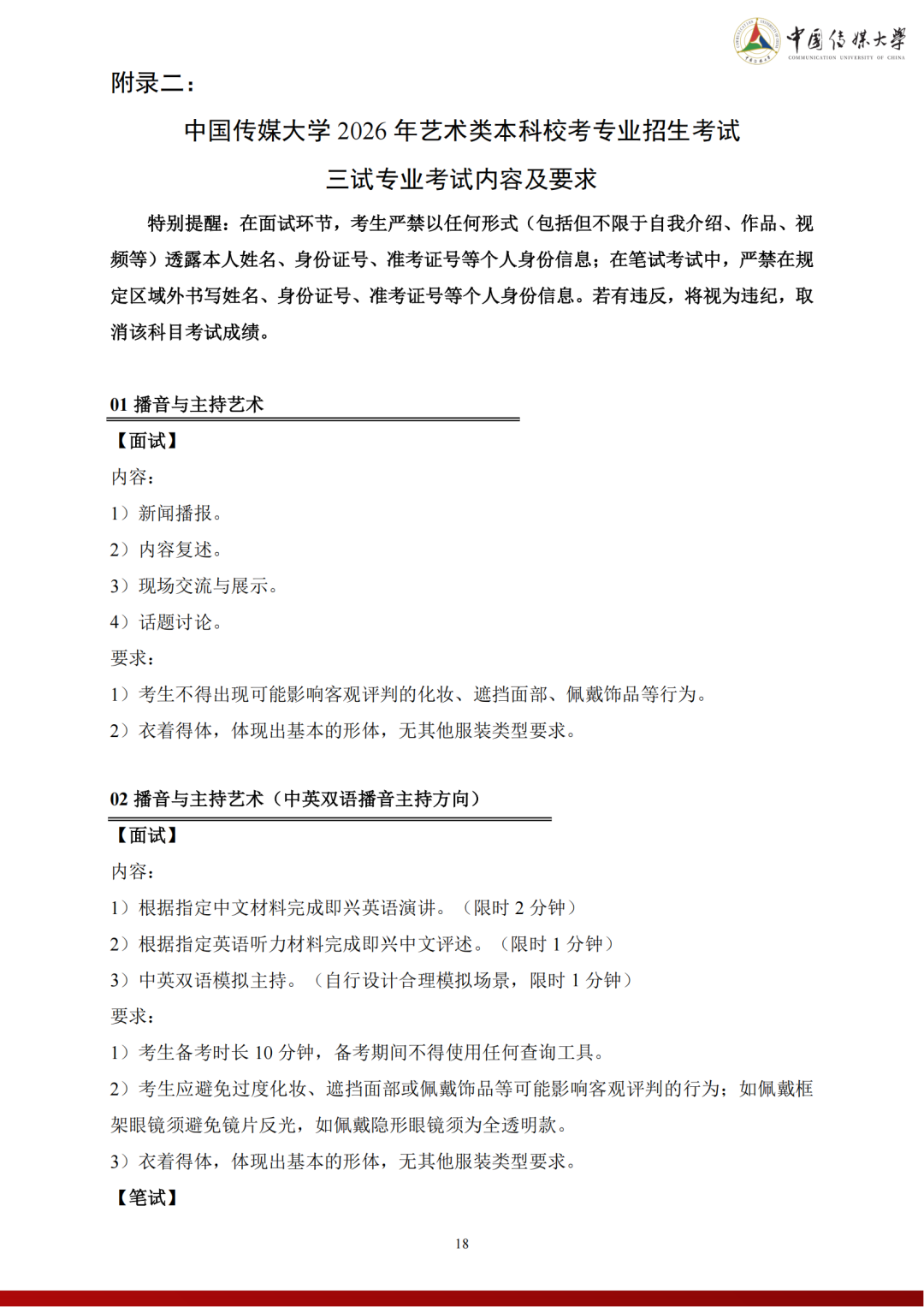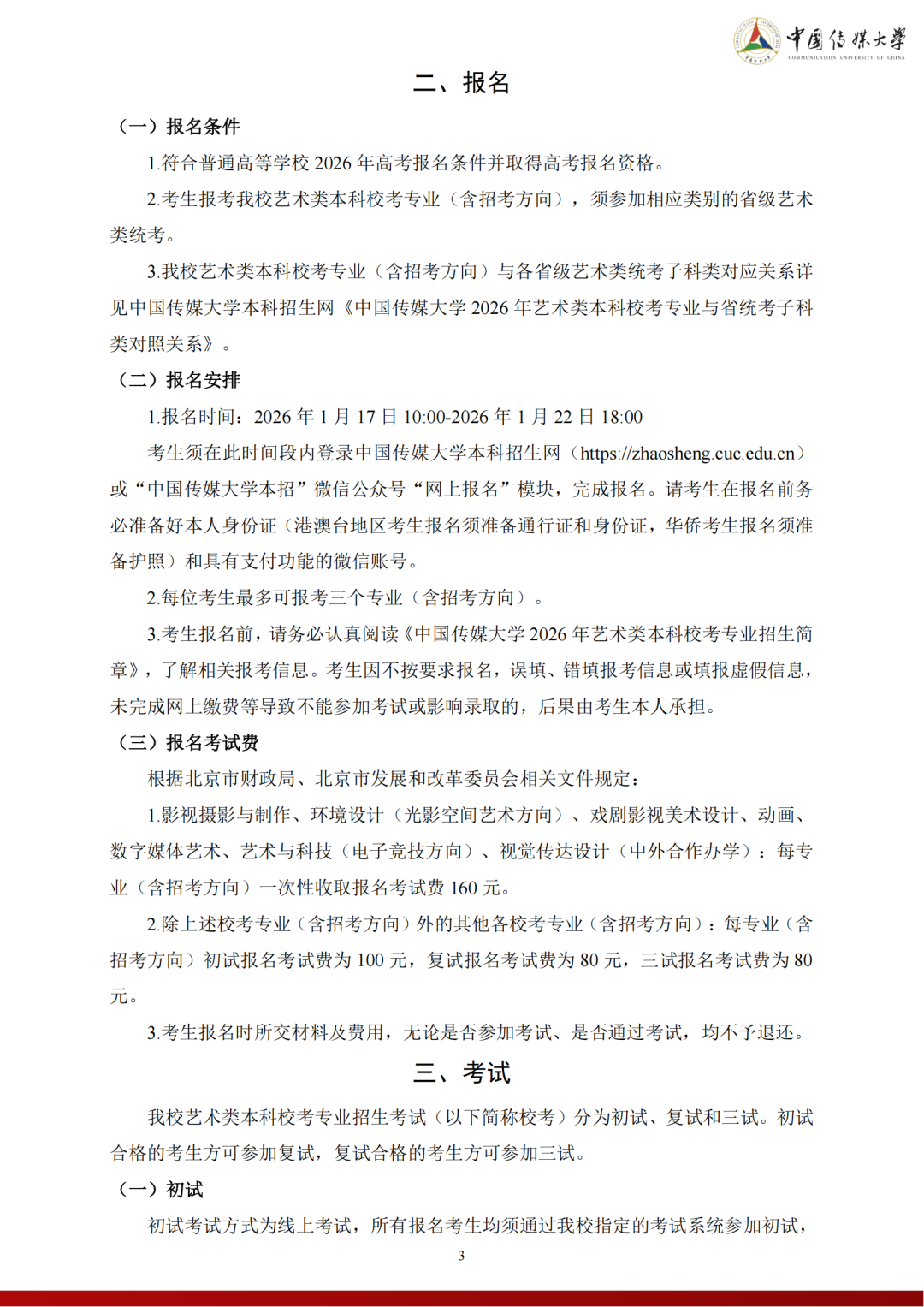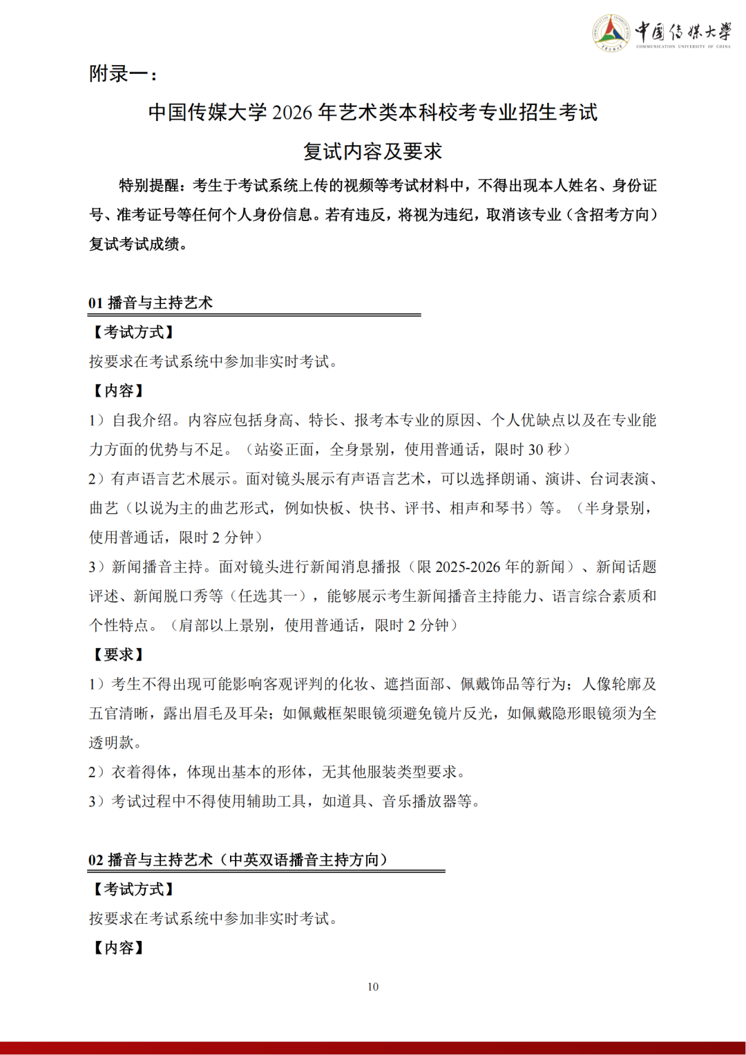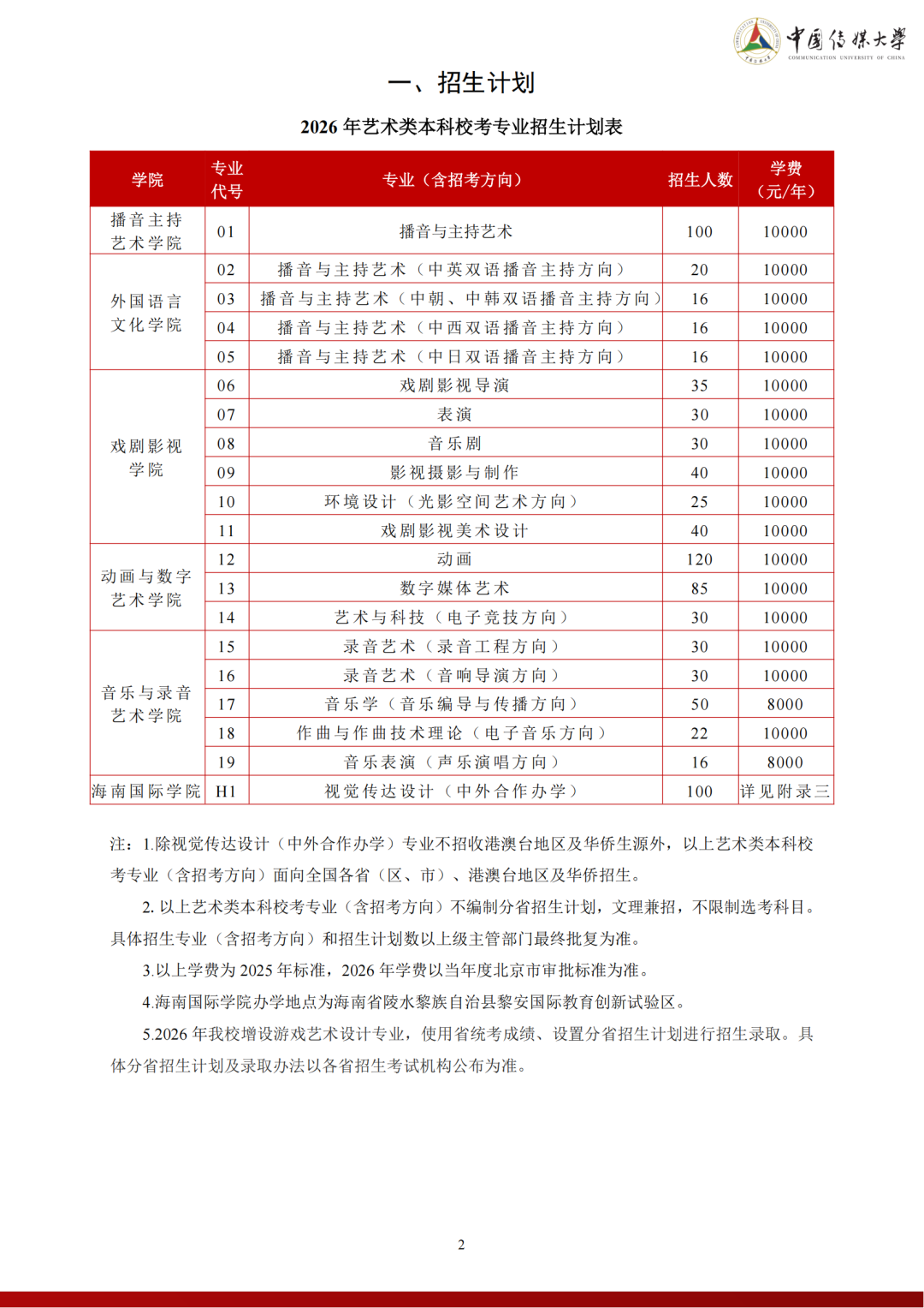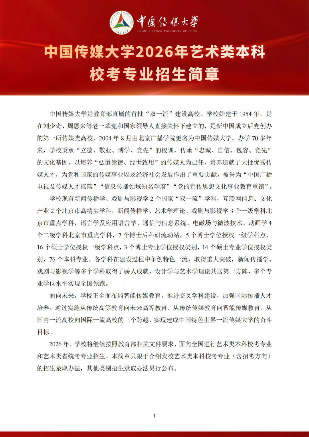 中国传媒大学2026年艺术类本科校考专业招生简章