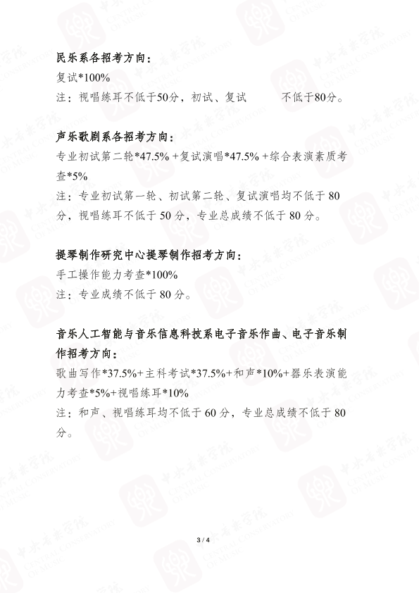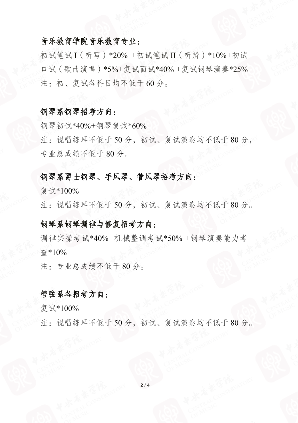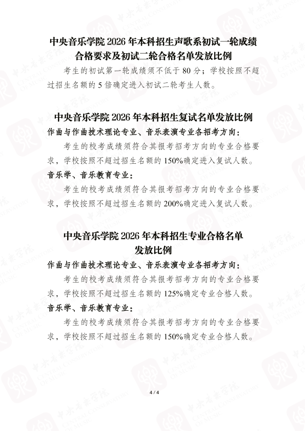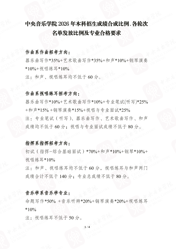 中央音乐学院2026年本科招生成绩合成比例、各轮次名单发放比例及专业合格要求