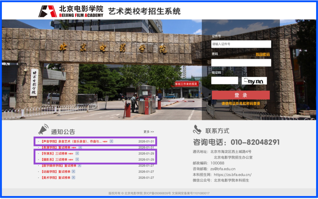 导演系戏剧影视导演专业,摄影系影视摄影与制作专业,声音学院作曲与作曲技术理论、录音艺术(音乐录音)专业的三试榜单(复试结果)已公布,考生可访问我校招生系统(https://bkbm.bfa.edu.cn)查询是否通过考试。