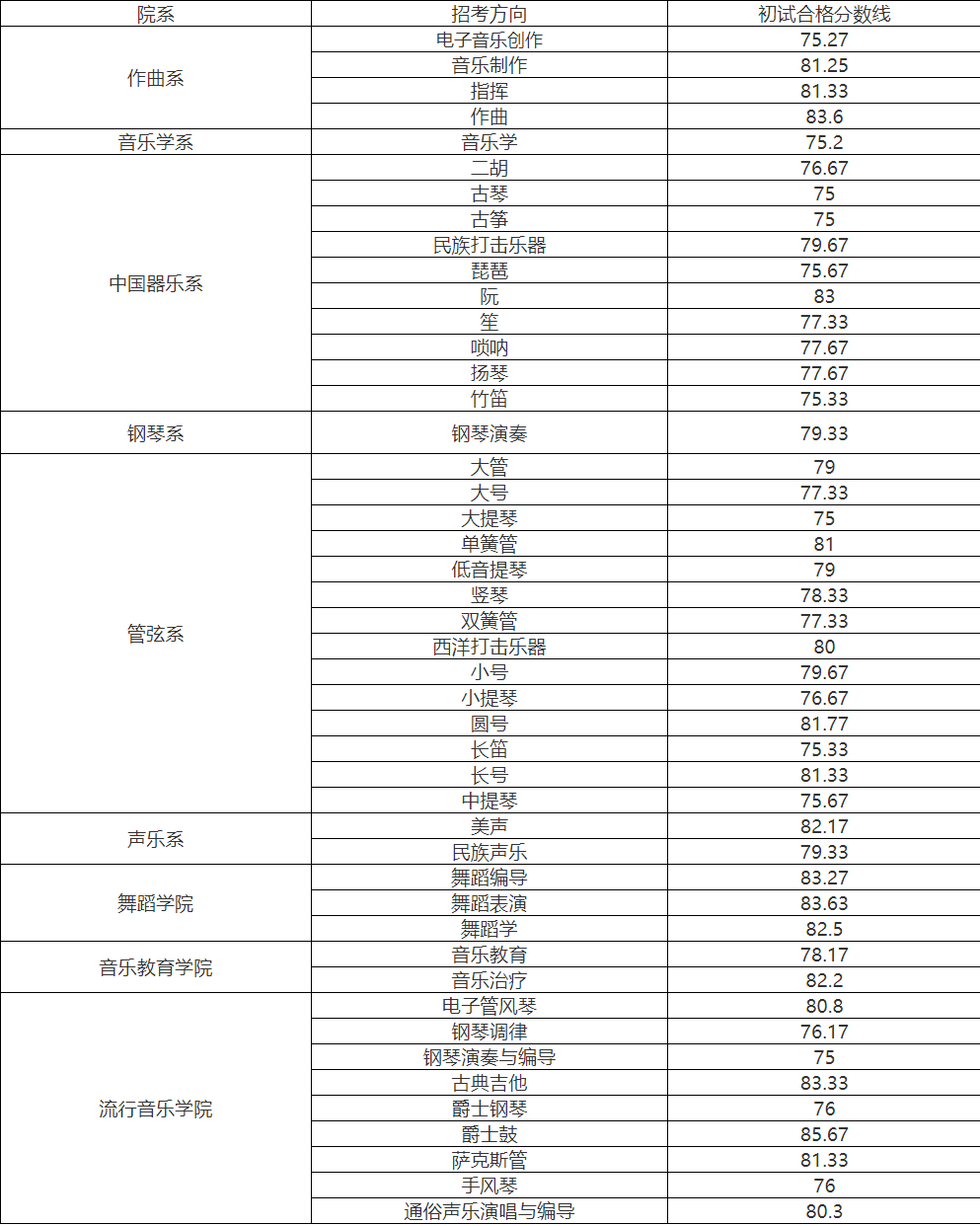 根据教育部艺术类专业招生有关文件精神和要求,结合我校招生考试实际,我校2026年普通本科招生初试各招考方向在初试成绩不低于75分控制线基础上,音乐教育、美声、民族声乐、通俗声乐演唱与编导按照不超过招生计划4倍,钢琴演奏、古筝、钢琴演奏与编导按照不超过招生计划5倍的比例产生初试合格分数线;其他各招考方向按照不超过招生计划6倍的比例产生初试合格分数线,末位同分考生顺延进入复试。