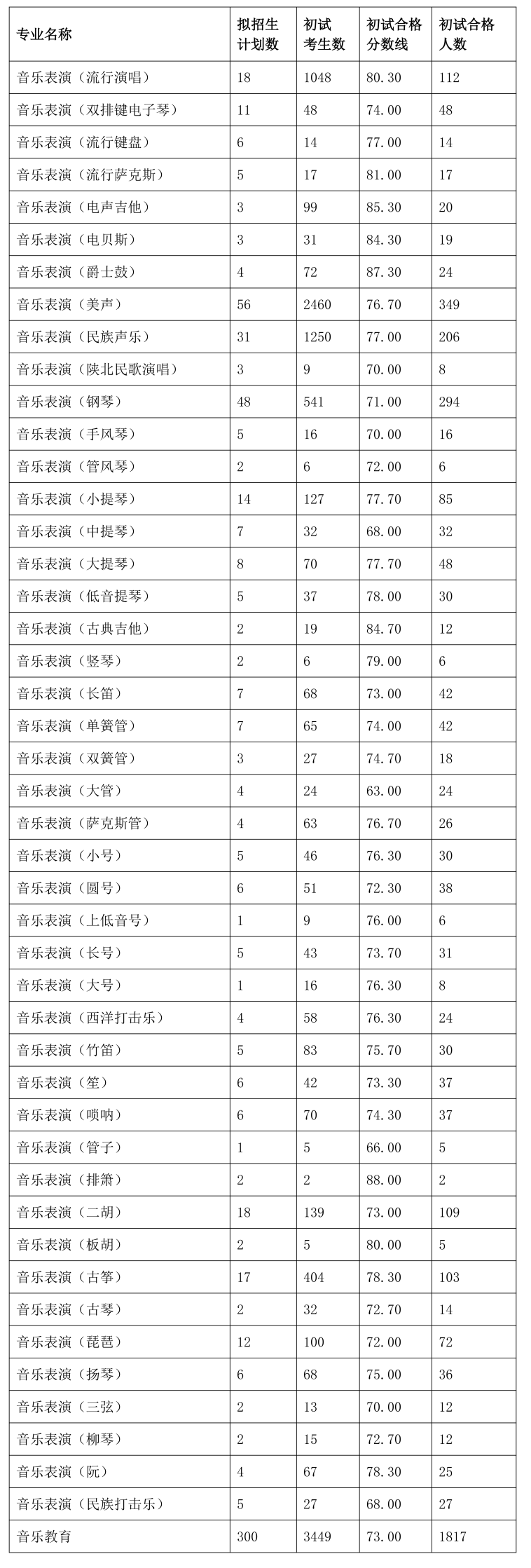 2.音乐表演及音乐教育专业方向:在成绩达到最低控制线的基础上,按照招生计划6倍的比例划定合格分数线。若末位出现同分考生,则末位同分顺延进入复试。报考人数或达到最低控制线人数不足招生计划6倍的专业方向,按照“宁缺毋滥”的原则,根据实际情况划定合格分数线。