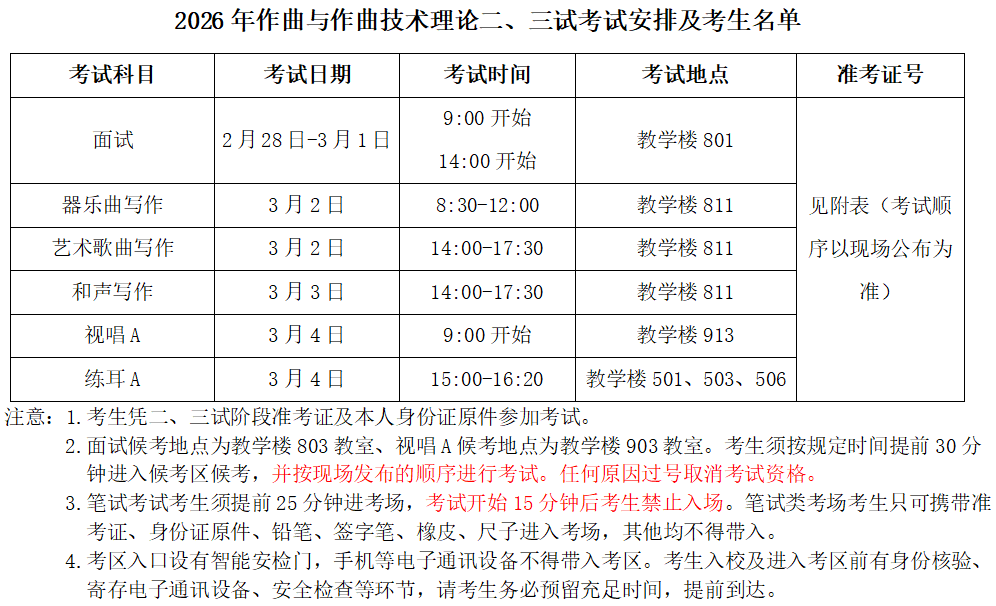 中国音乐学院2026年作曲与作曲技术理论二、三试考试安排及考生名单