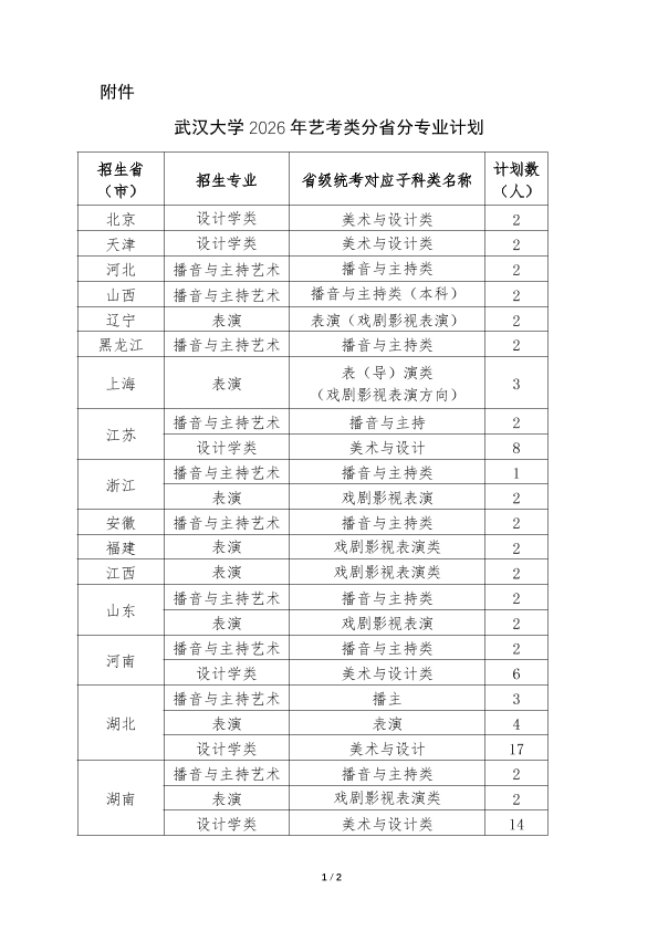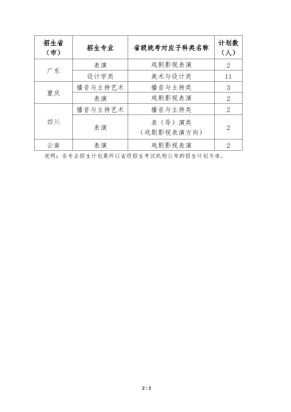 艺考类分省分专业计划及对应省级统考子科类详见附件,最终以省级招生考试机构公布的招生计划为准。