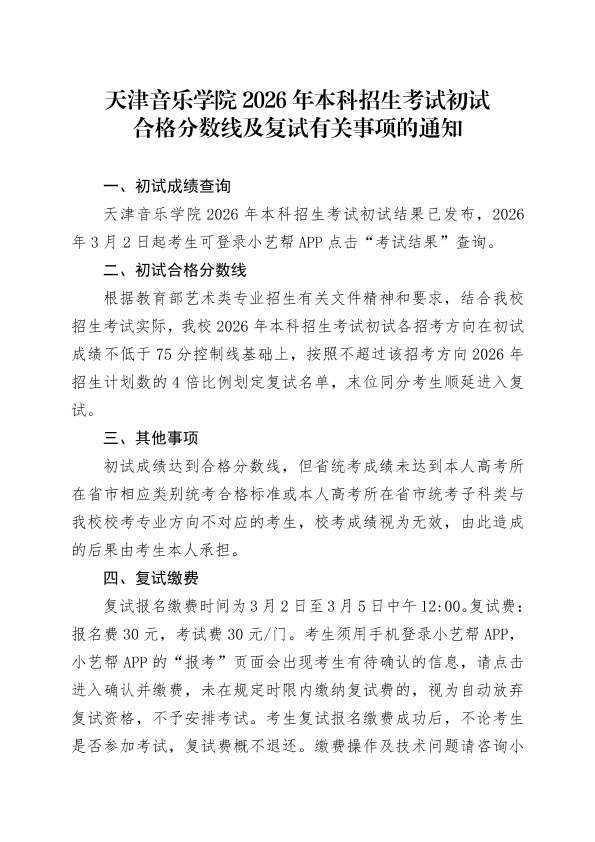天津音乐学院2026年本科招生考试初试合格分数线及复试有关事项的通知