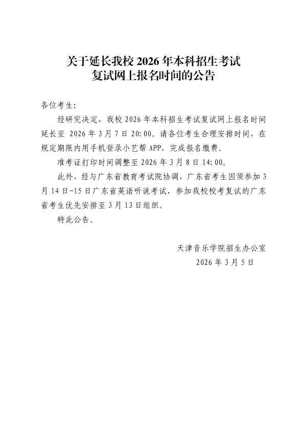 关于延长天津音乐学院2026年本科招生考试复试网上报名时间的公告