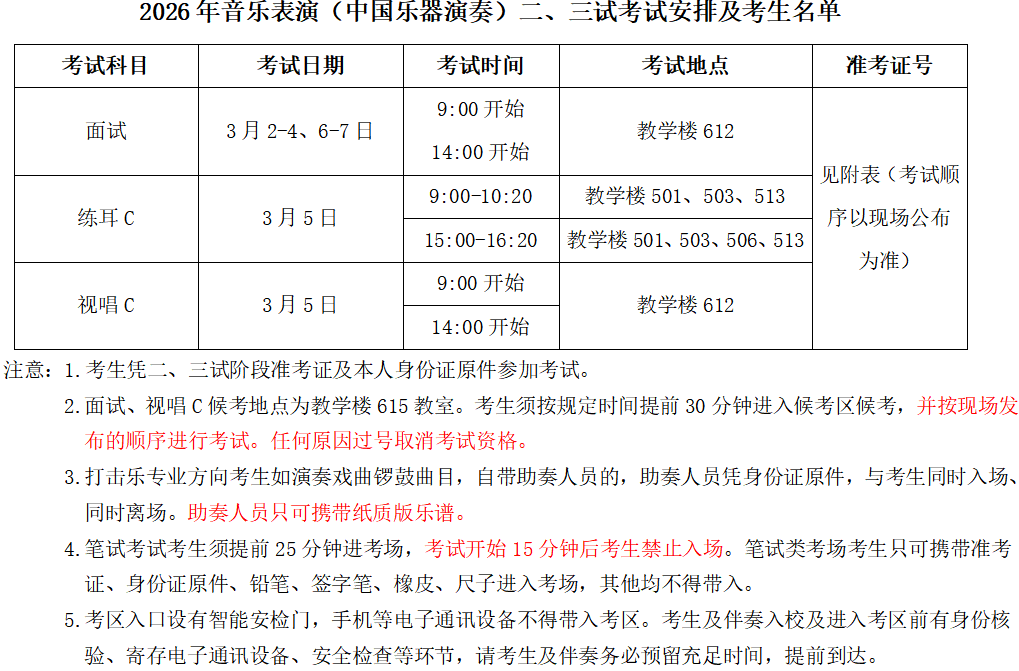 中国音乐学院2026年音乐表演(中国乐器演奏)二、三试考试安排及考生名单