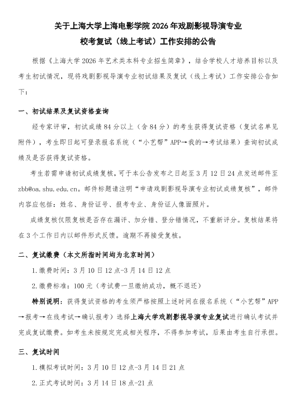 关于上海大学上海电影学院2026年戏剧影视导演专业校考复试(线上考试)工作安排的公告