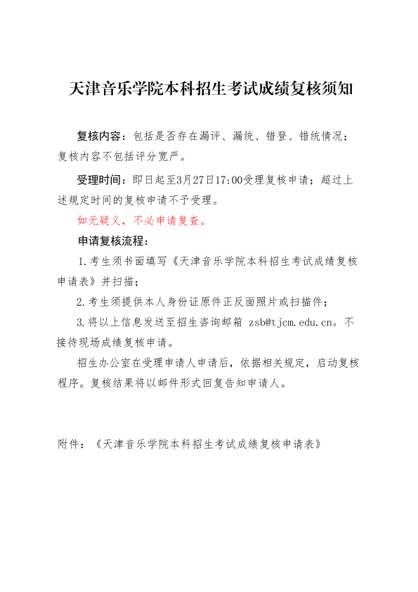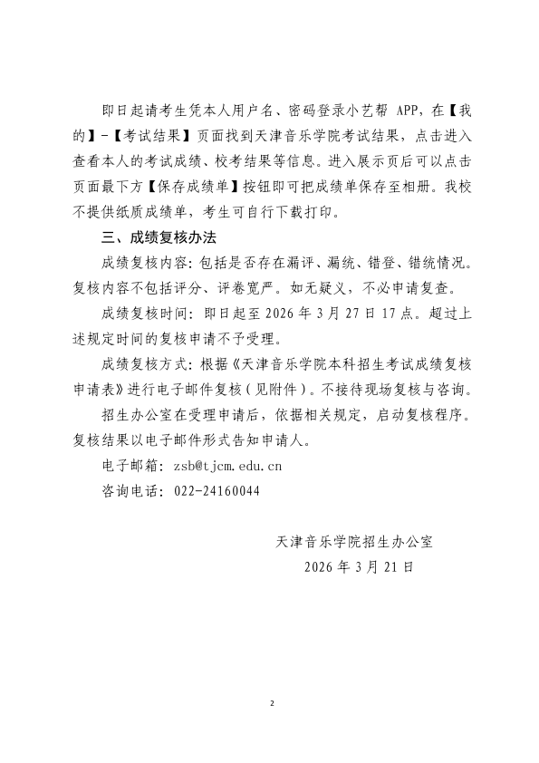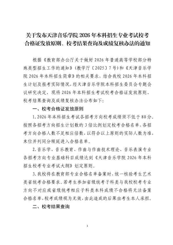 关于发布天津音乐学院2026年本科招生专业考试校考合格证发放原则、校考结果查询及成绩复核办法的通知