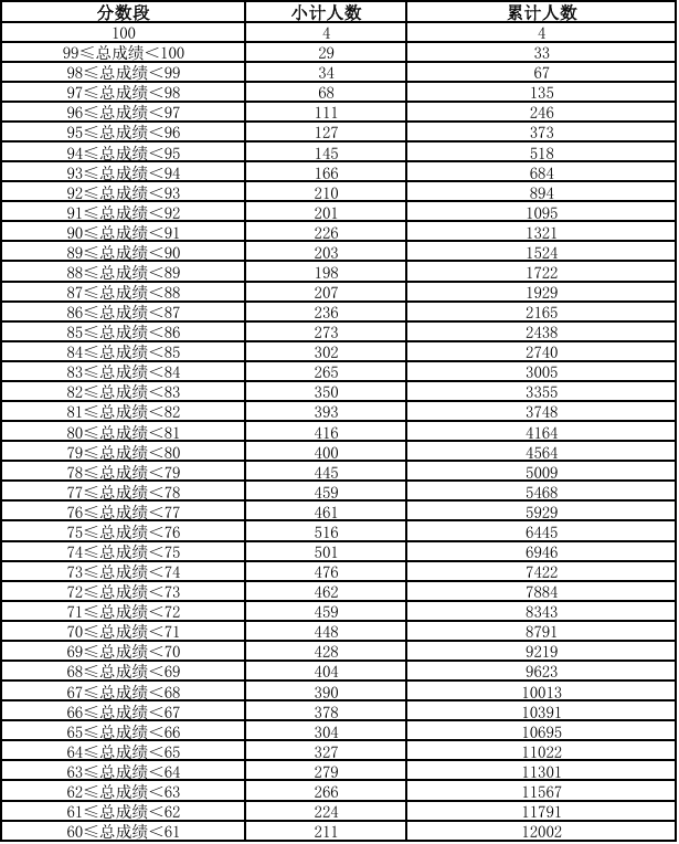 云南省2026年体育专业统考合格考生总成绩分数段统计表