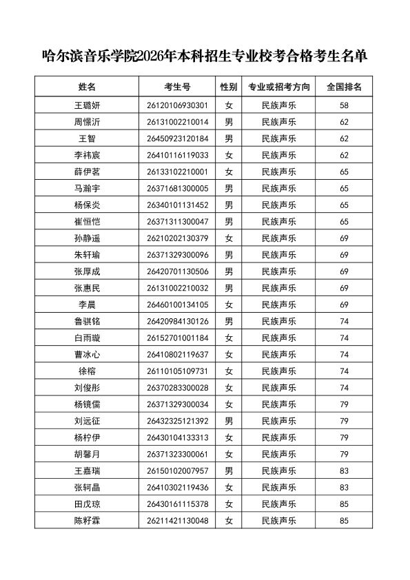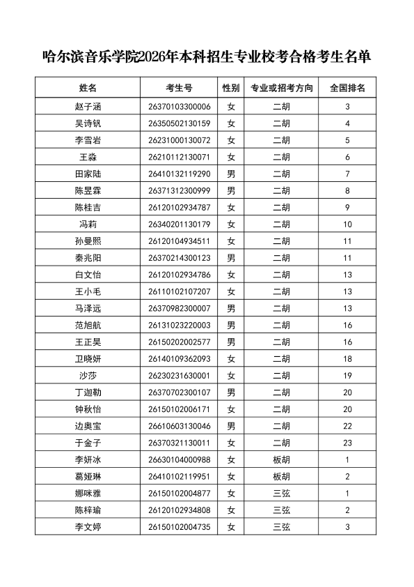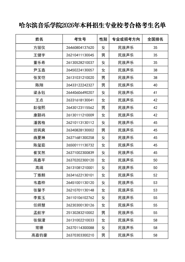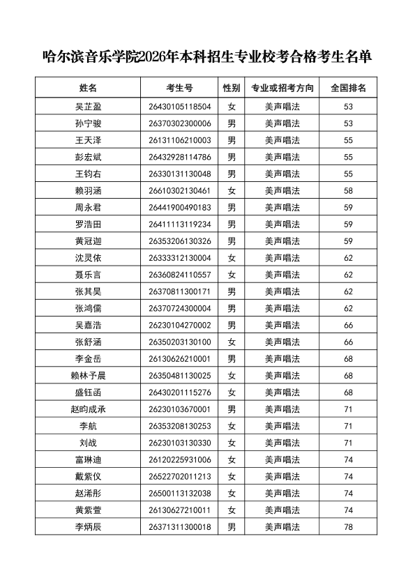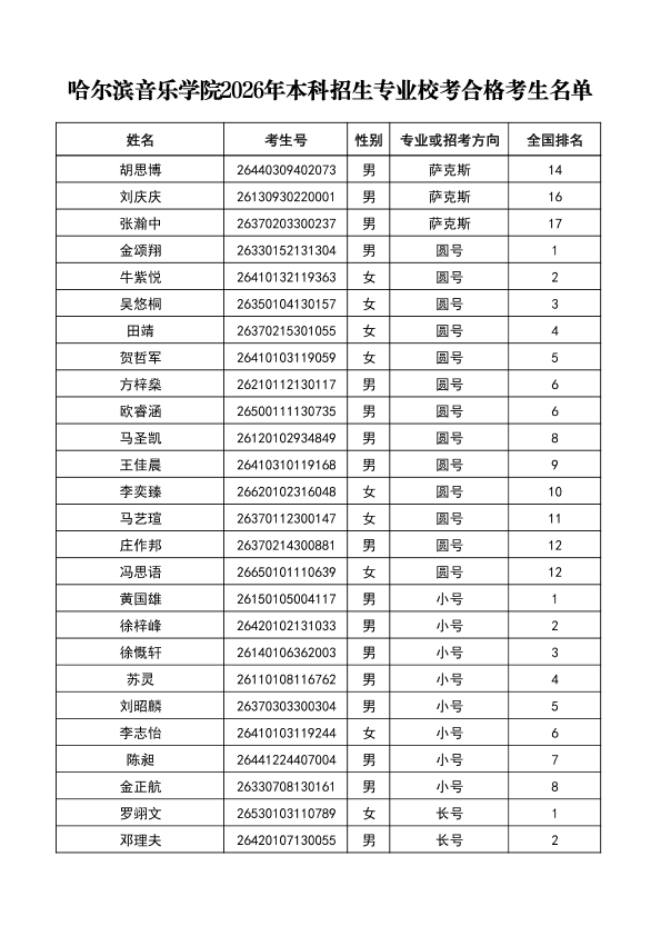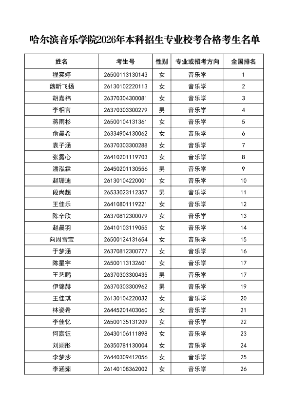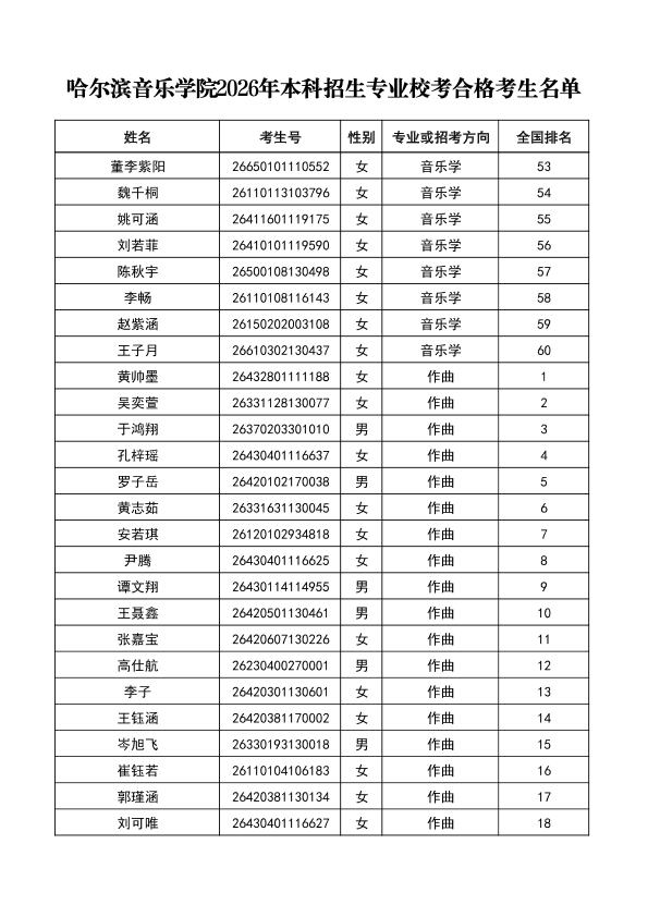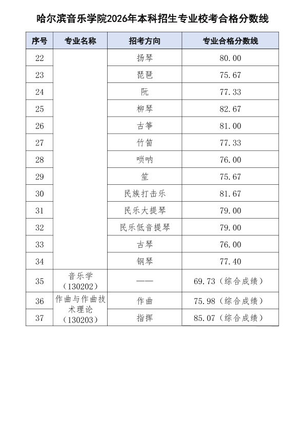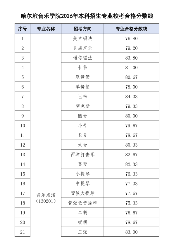 哈尔滨音乐学院关于公布2026年本科招生专业校考合格分数线、合格考生名单及成绩复核办法的通知