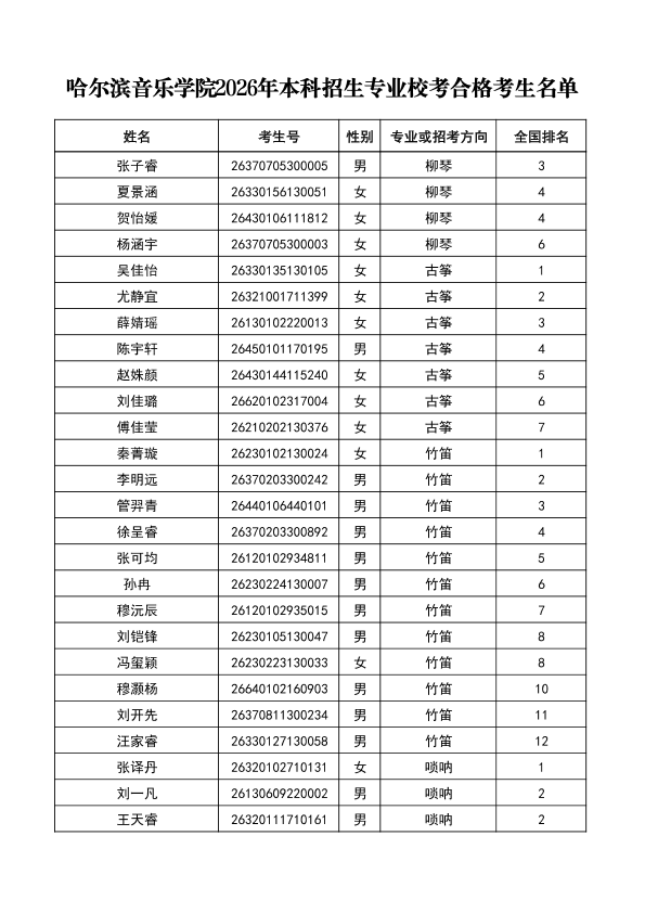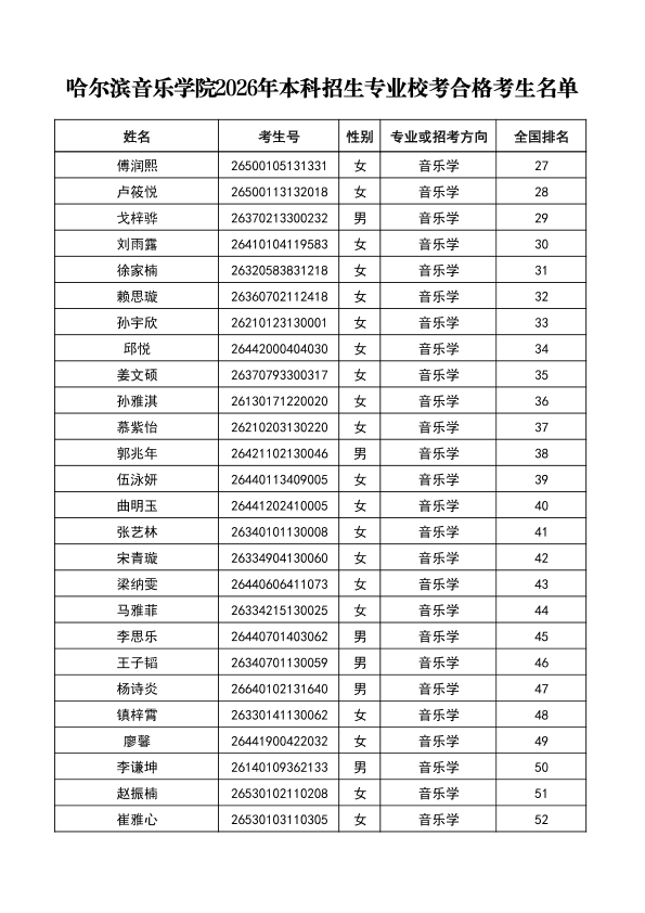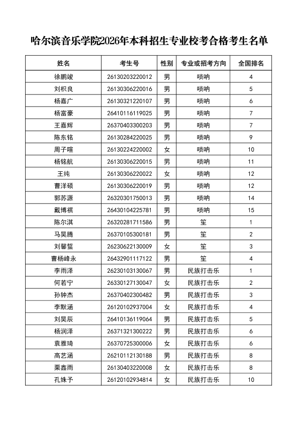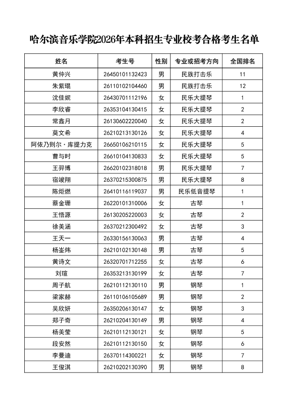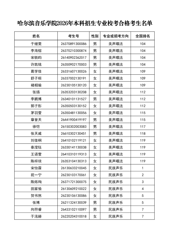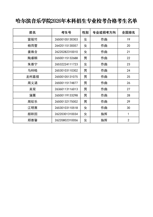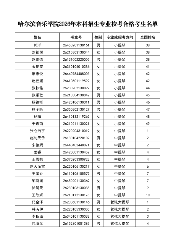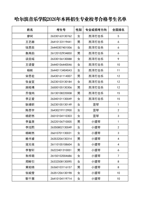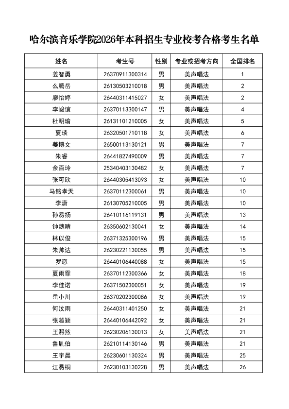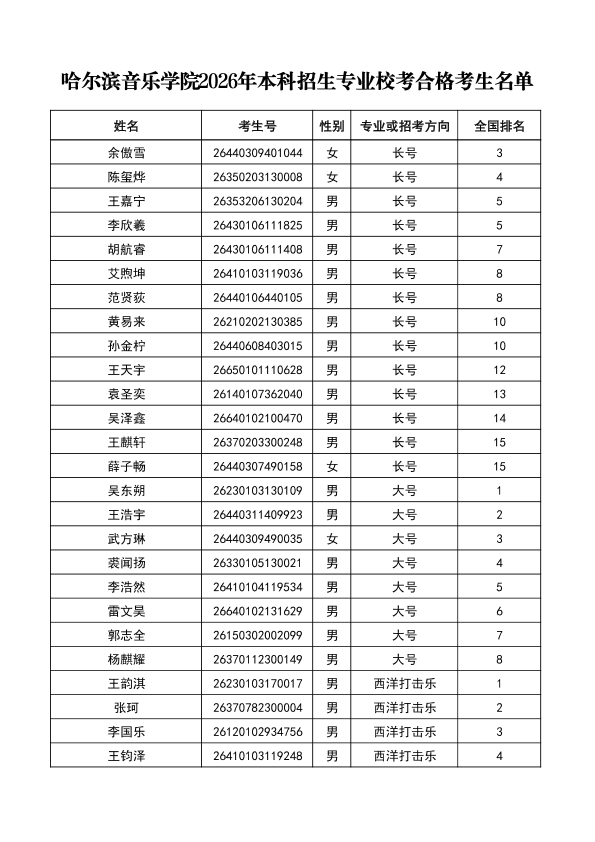 哈尔滨音乐学院关于公布2026年本科招生专业校考合格分数线、合格考生名单及成绩复核办法的通知