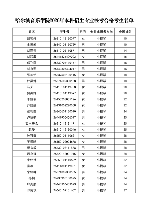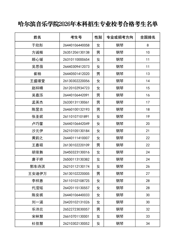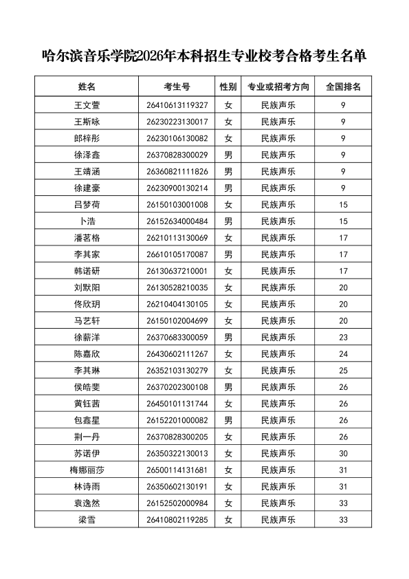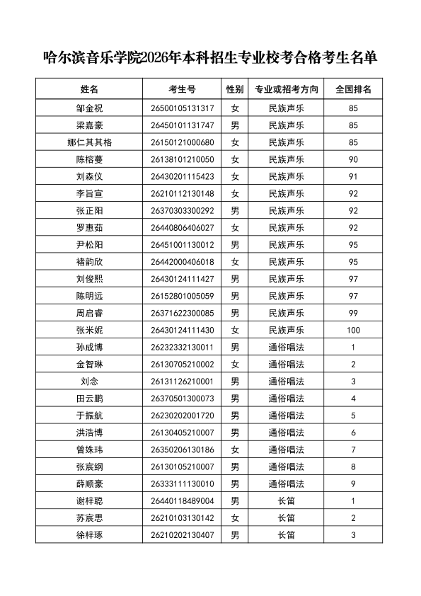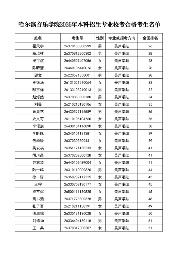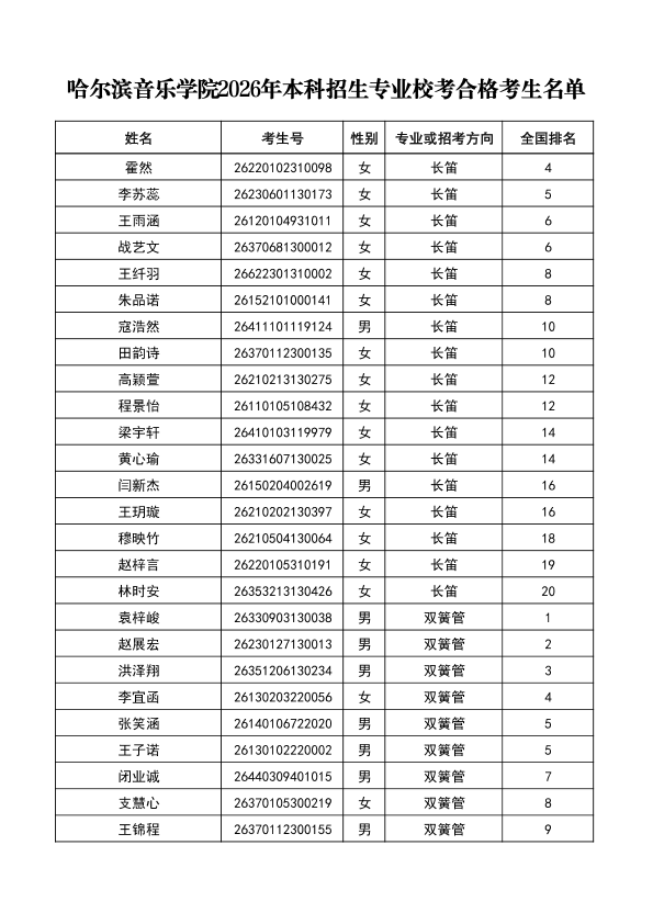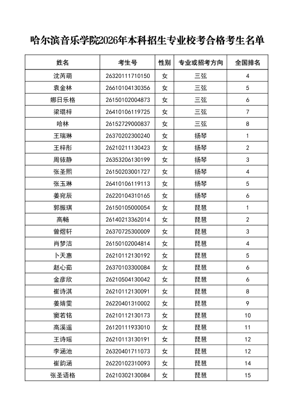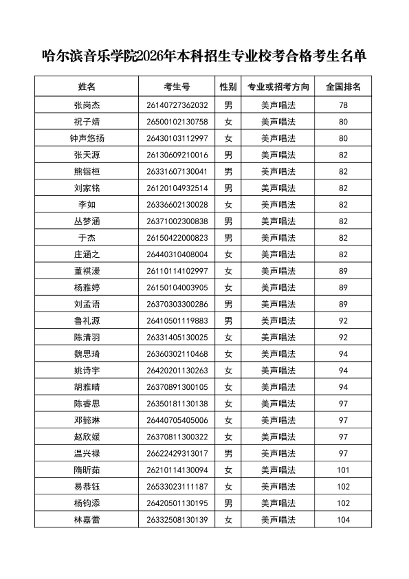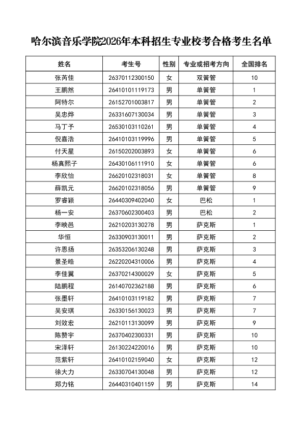 哈尔滨音乐学院关于公布2026年本科招生专业校考合格分数线、合格考生名单及成绩复核办法的通知